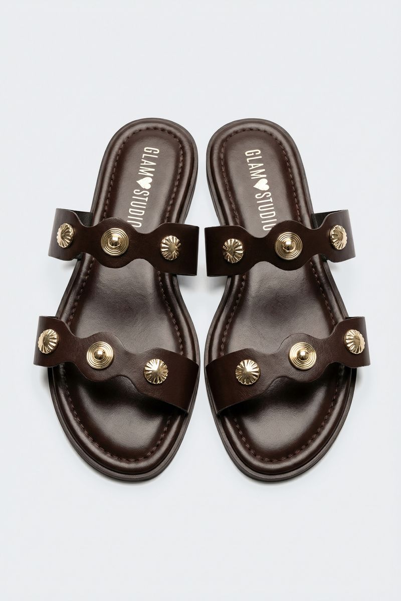 Combine esta rasteira marrom com vestidos fluidos de verão, saias midi ou shorts jeans para um visual casual chic. Para um toque mais sofisticado, use com calças de linho e blusas leves. Acessórios dourados realçam as tachas, enquanto bolsas de palha ou ráfia complementam o estilo natural dos tons terrosos.