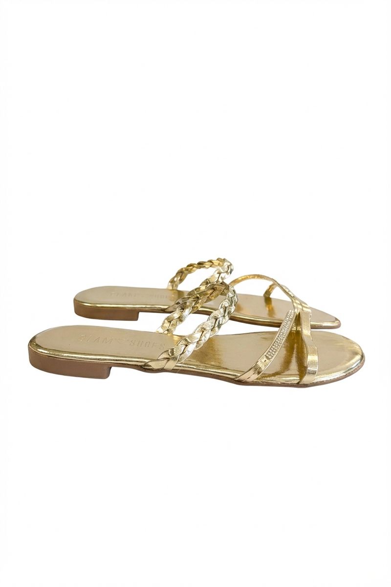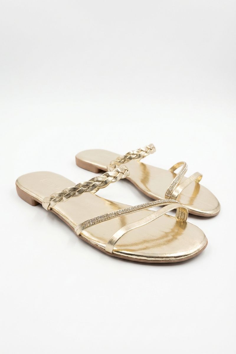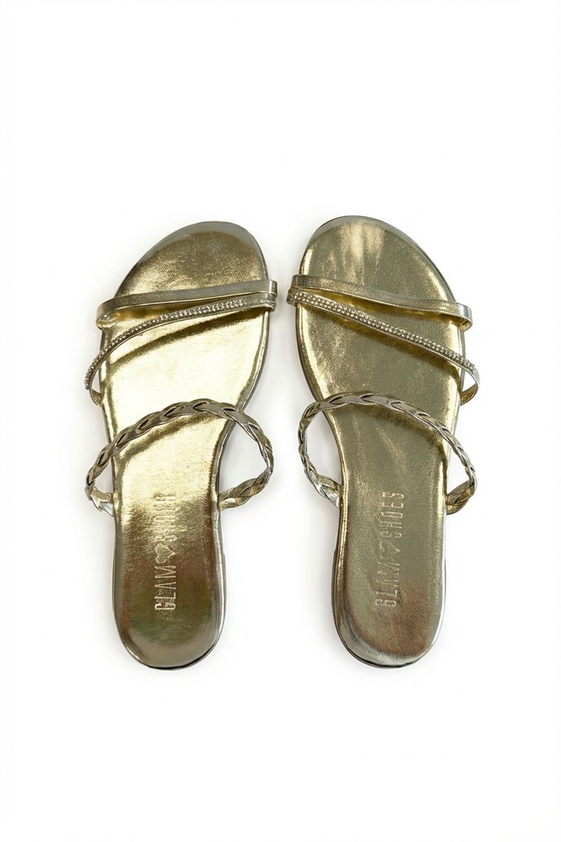 Deslumbre com a Rasteira Dourada Elegante Caedu, perfeita para quem busca moda e conforto. Suas tiras trançadas e o brilho dos strass adicionam um toque sofisticado, enquanto o material de borracha garante leveza. Ideal para realçar seu estilo com um toque de glamour.