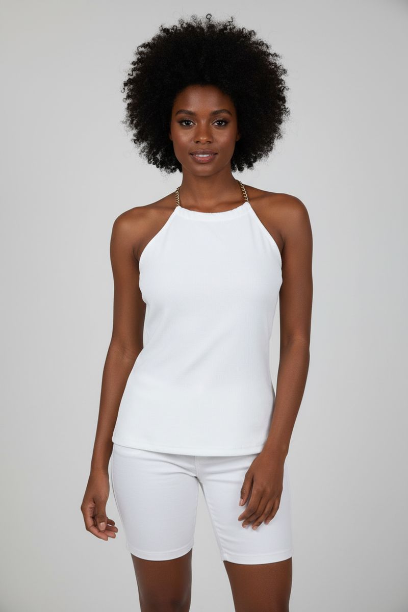 Eleve seu estilo com a Regata Halter Canelada Off White da Caedu. Esta peça única combina a sofisticação da gola halter com o charme da corrente dourada, ideal para quem busca moda e conforto. Sua textura canelada e cor neutra garantem versatilidade para diversas ocasiões, tornando-a um item essencial em suas roupas Caedu.
