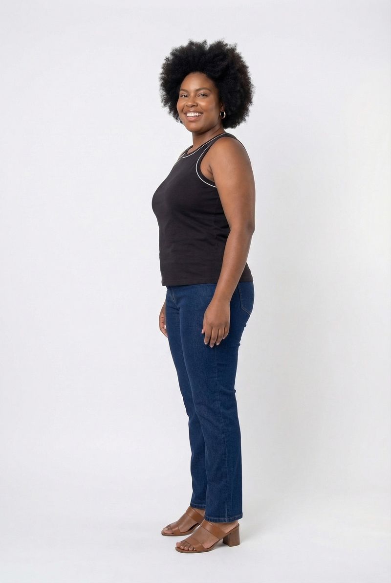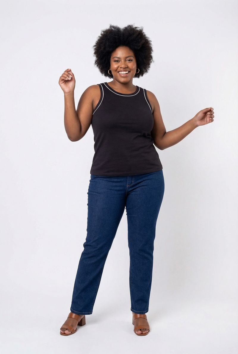 Combine sua regata preta com uma calça jeans escura para um visual clássico. Para um toque elegante, adicione sandálias de salto bloco. Experimente com shorts ou saias para dias quentes, ou use-a sob uma jaqueta para um estilo despojado. Crie looks versáteis para qualquer momento, do casual ao mais arrumado.