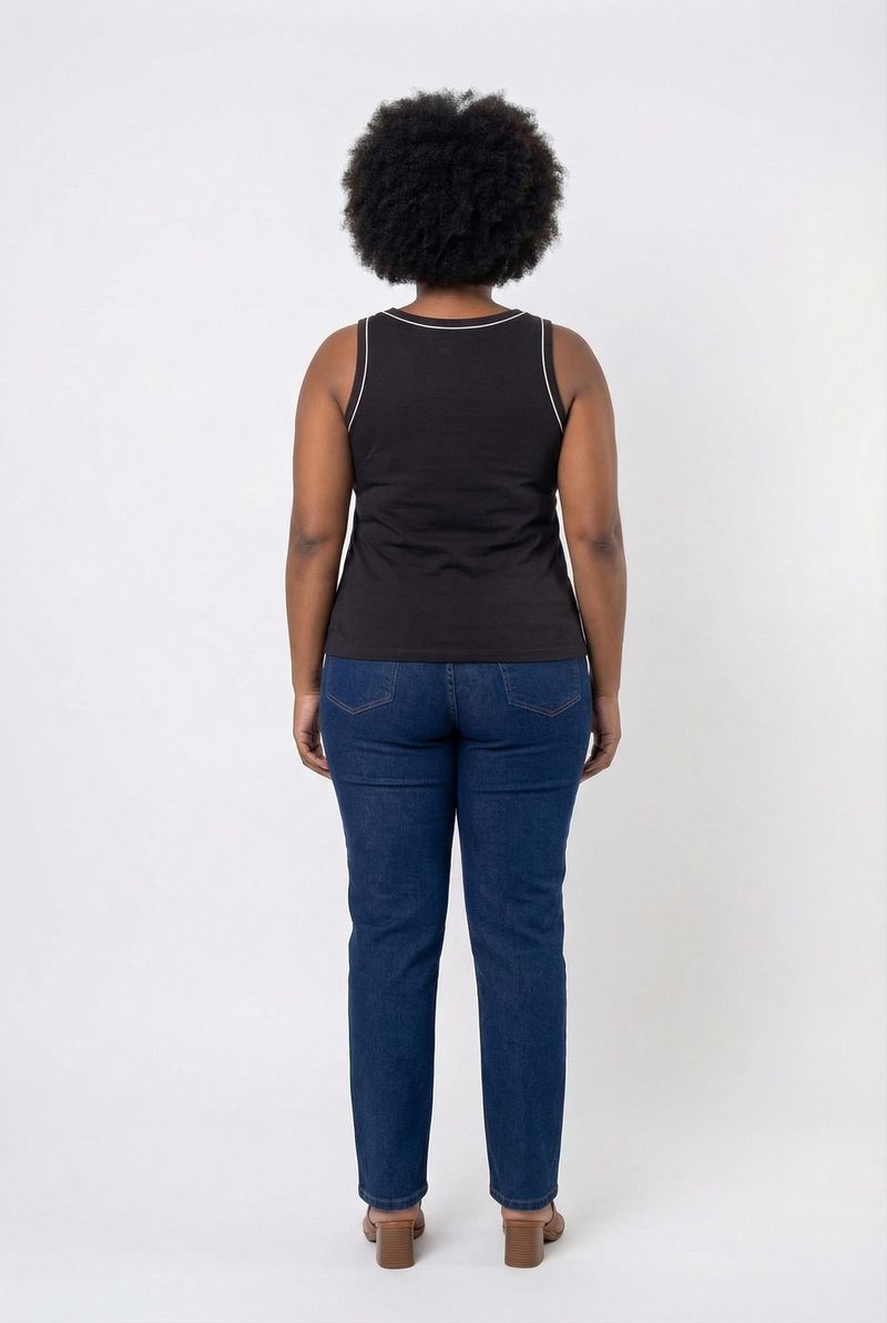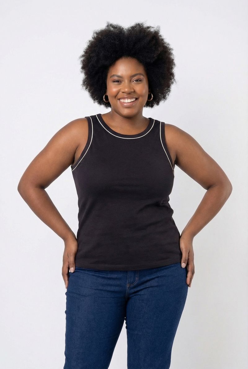 Eleve seu estilo com a Regata Feminina Caedu Preta com Viés Branco Contraste. Confortável e versátil, esta peça essencial apresenta decote redondo e acabamento em viés branco, ideal para looks modernos e sofisticados. Essencial na moda feminina.