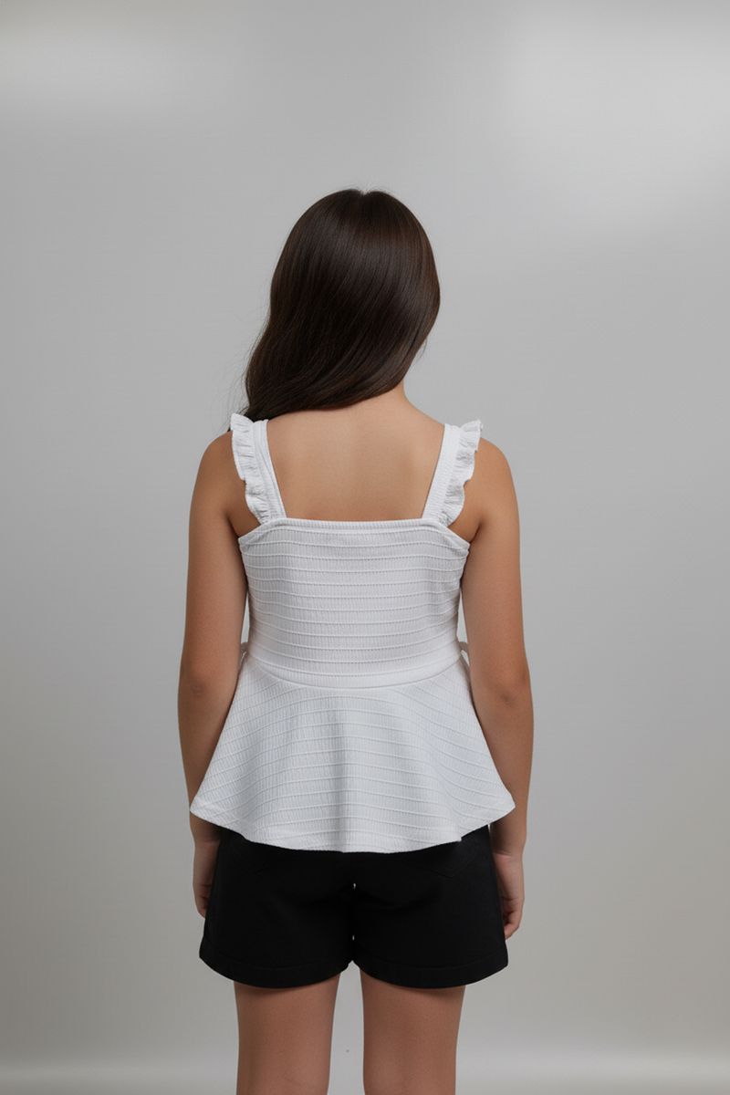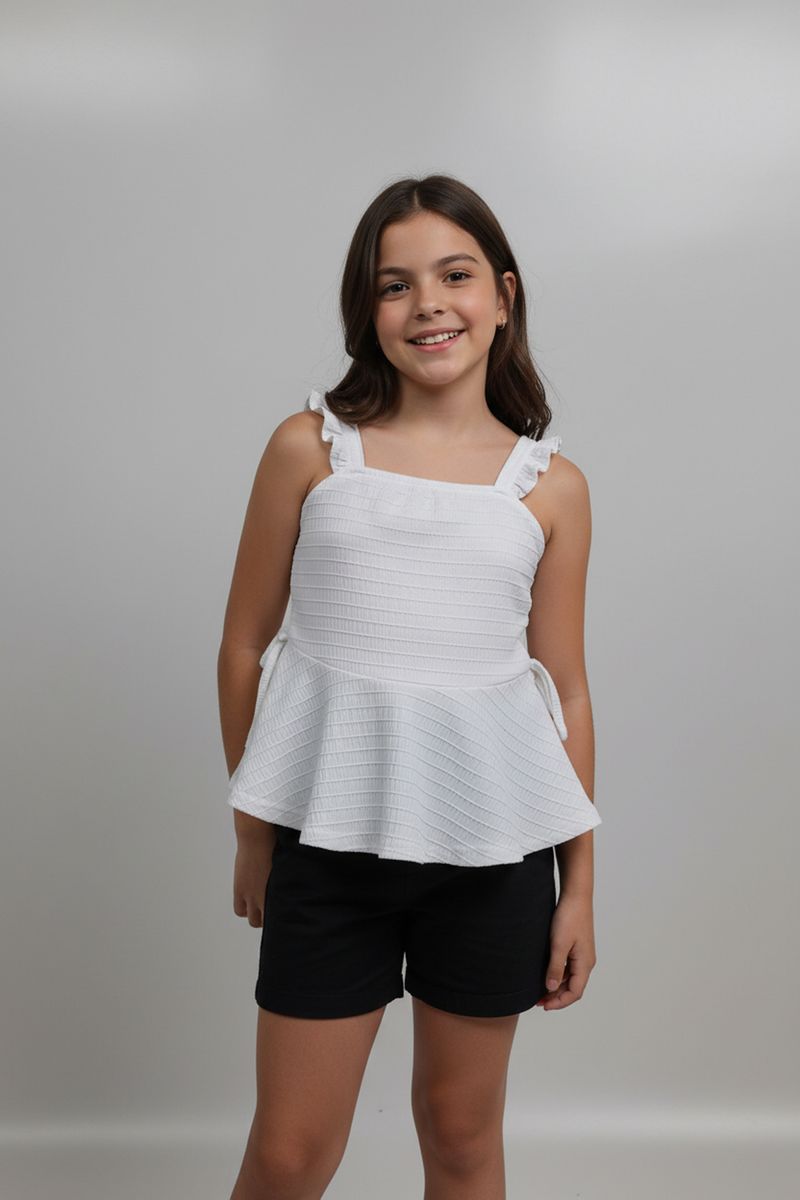 A Blusa Infantil Peplum Anarruga Off White Caedu oferece um visual encantador e confortável para as meninas. Com decote quadrado, alças franzidas e modelagem peplum, esta blusa infantil possui um tecido anarruga texturizado que garante estilo único. Perfeita para um look moderno e cheio de charme.