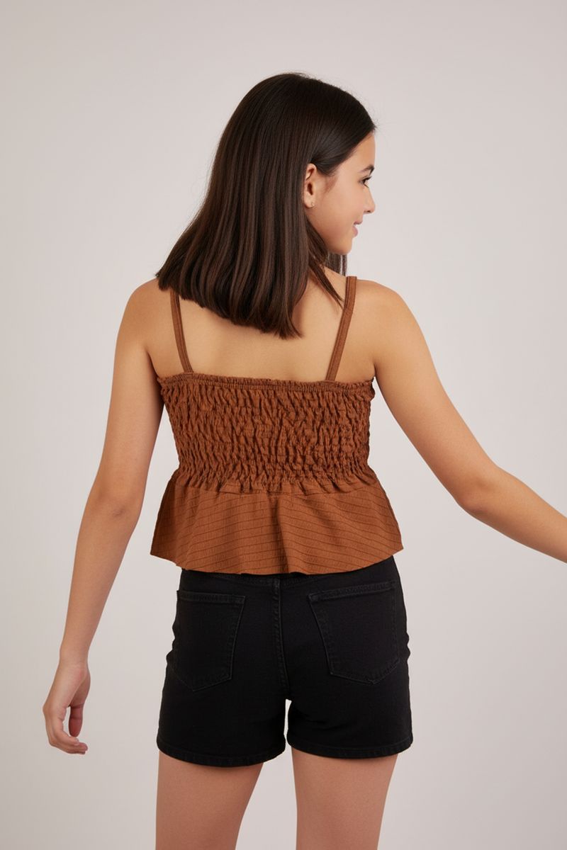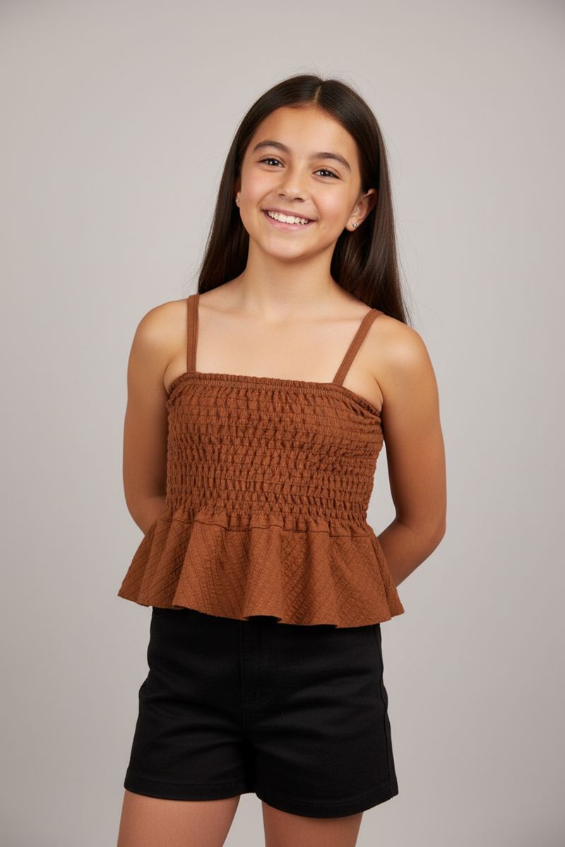 A Blusa Cropped Infantil Menina Marrom Claro Lastex Babado é moderna e confortável. Em anaruga (97% poliéster, 3% elastano), garante ajuste e liberdade. Essencial na moda infantil, esta blusa cropped juvenil da Caedu.