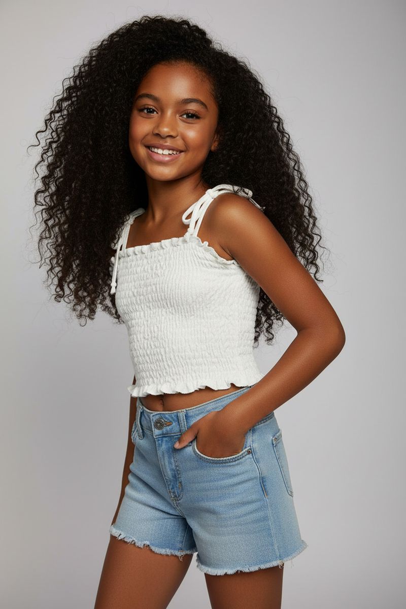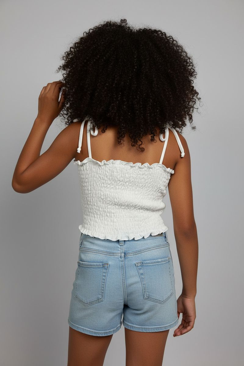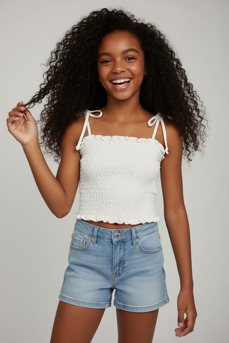 A Regata Cropped Branca Juvenil Caedu é a escolha ideal para um visual moderno e cheio de personalidade. Com seu lastex e alças de amarrar, oferece um ajuste confortável e um toque de charme. Perfeita para meninas que buscam roupas estilosas e versáteis na moda juvenil.