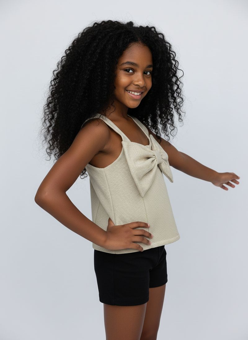 Desperte o brilho interior com a Regata Juvenil Dourada com Maxi Laço Frontal e Brilho Lurex Caedu! Uma peça de moda que combina estilo e conforto, perfeita para as jovens que amam se destacar. Com seu deslumbrante brilho lurex e o charmoso maxi laço, esta regata é a escolha ideal para criar roupas cheias de personalidade.