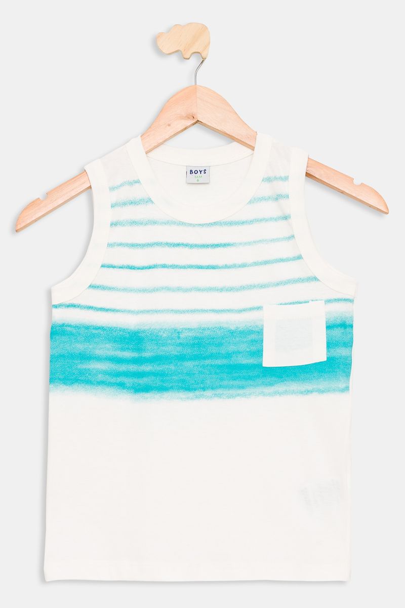 Descubra a Regata Infantil Listrada Off White da Caedu, perfeita para os pequenos! Confeccionada em meia malha 100% algodão, oferece máximo conforto e suavidade. Seu design charmoso com listras irregulares em azul turquesa e gola redonda proporciona um visual moderno e despojado. Ideal para um look casual e cheio de vida, garantindo liberdade para brincar.