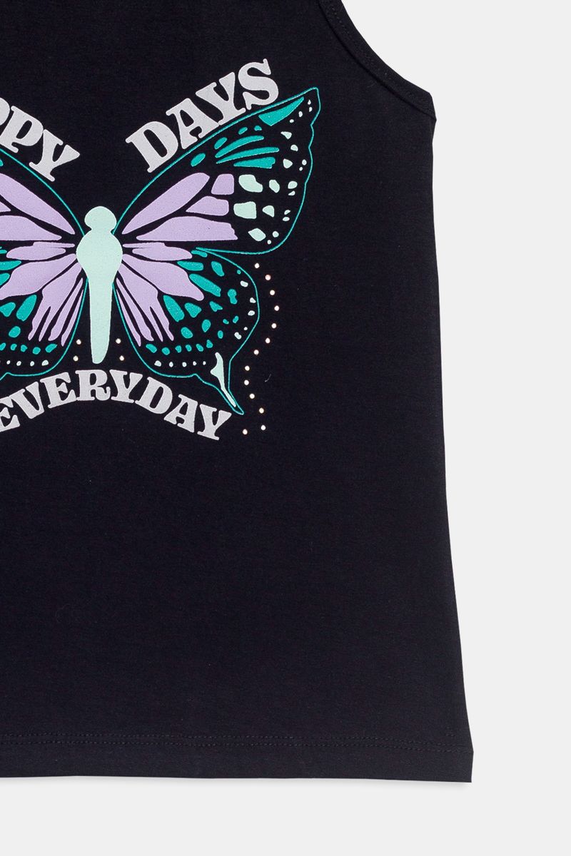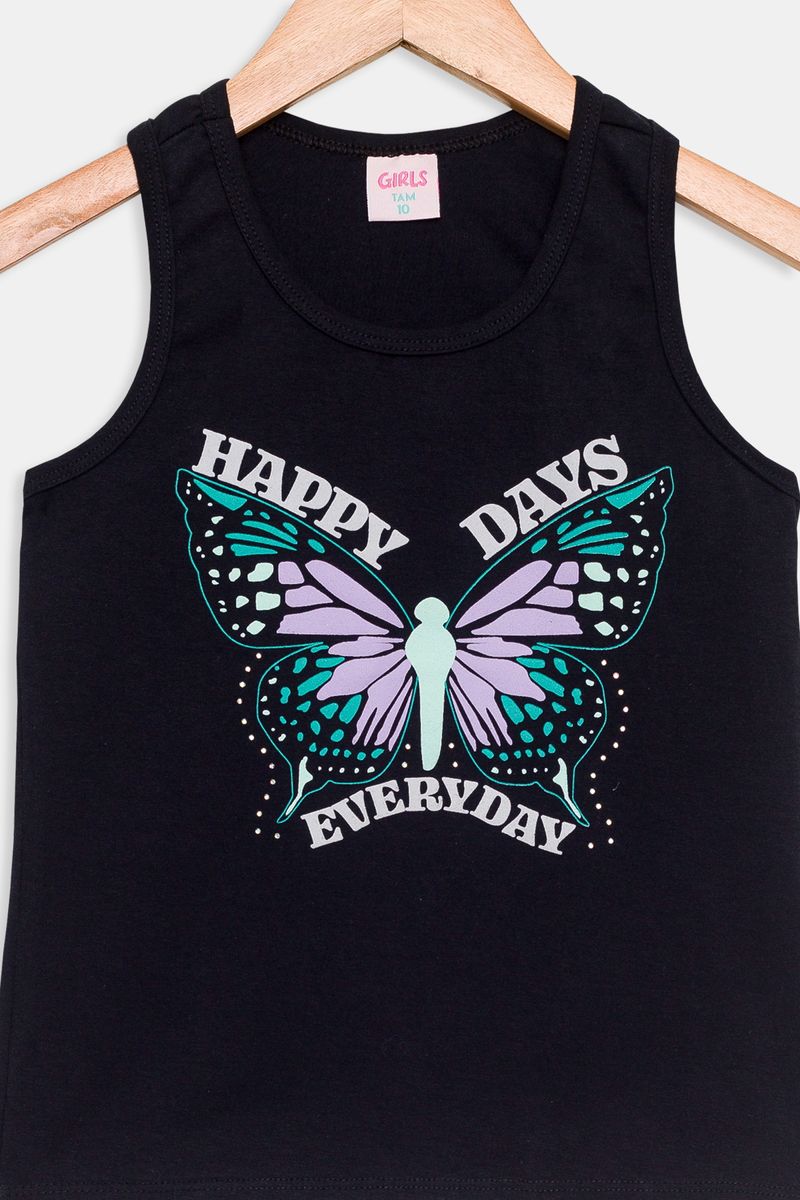 Detalhes: Estampa de borboleta colorida com frase "Happy days everyday"