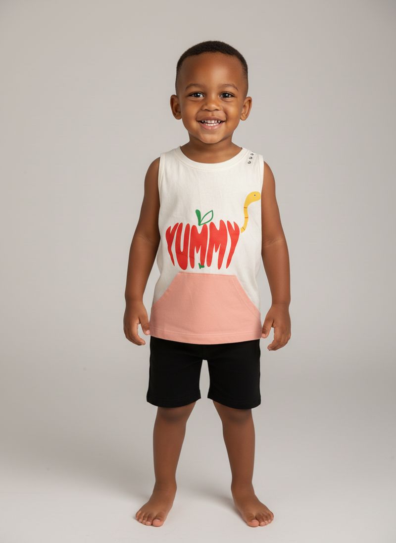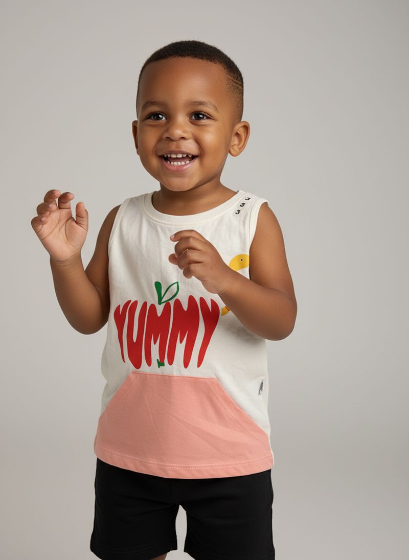 Combine a Regata Bebê Estampada Maçã Yummy com um shorts preto liso para um visual descontraído. Para um toque de charme, adicione um tênis infantil colorido e um boné divertido. Esta roupa versátil permite criar looks adoráveis.