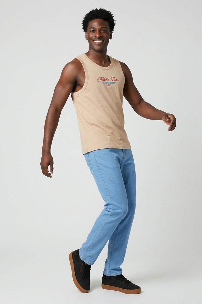 Combine sua regata bege médio com bermudas jeans para um visual descontraído, ou com calças chino para um toque mais arrumado. Para os pés, tênis casuais ou sandálias complementam o look. Adicione uma camisa de botão aberta ou uma jaqueta leve para as noites mais frescas, criando um estilo versátil e moderno com roupas Caedu.