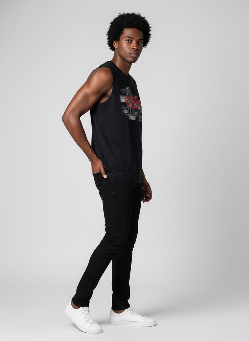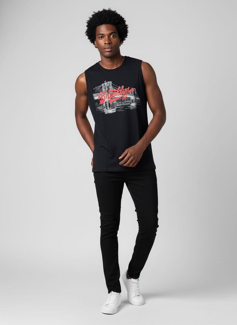 A Regata Masculina Estampada Brooklyn Bridge Silk Preta Caedu oferece conforto e estilo urbano. Feita em 100% algodão e meia malha, sua estampa da Ponte do Brooklyn é ideal para um visual moderno e cheio de moda.