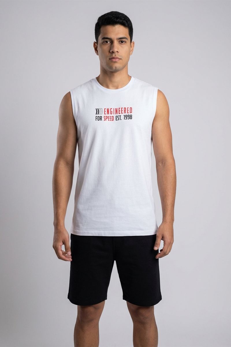 Experimente a regata masculina Caedu, perfeita para quem busca conforto e estilo. Confeccionada em meia malha 100% algodão, esta roupa oferece toque suave e caimento ideal. Destaque-se com a estampa exclusiva 'Engineered For Speed', um ícone da moda urbana.