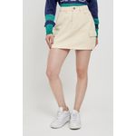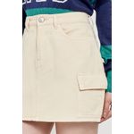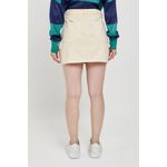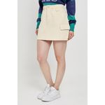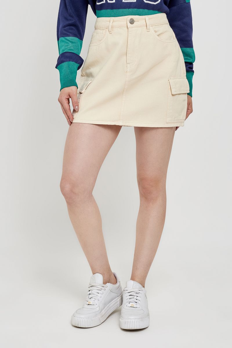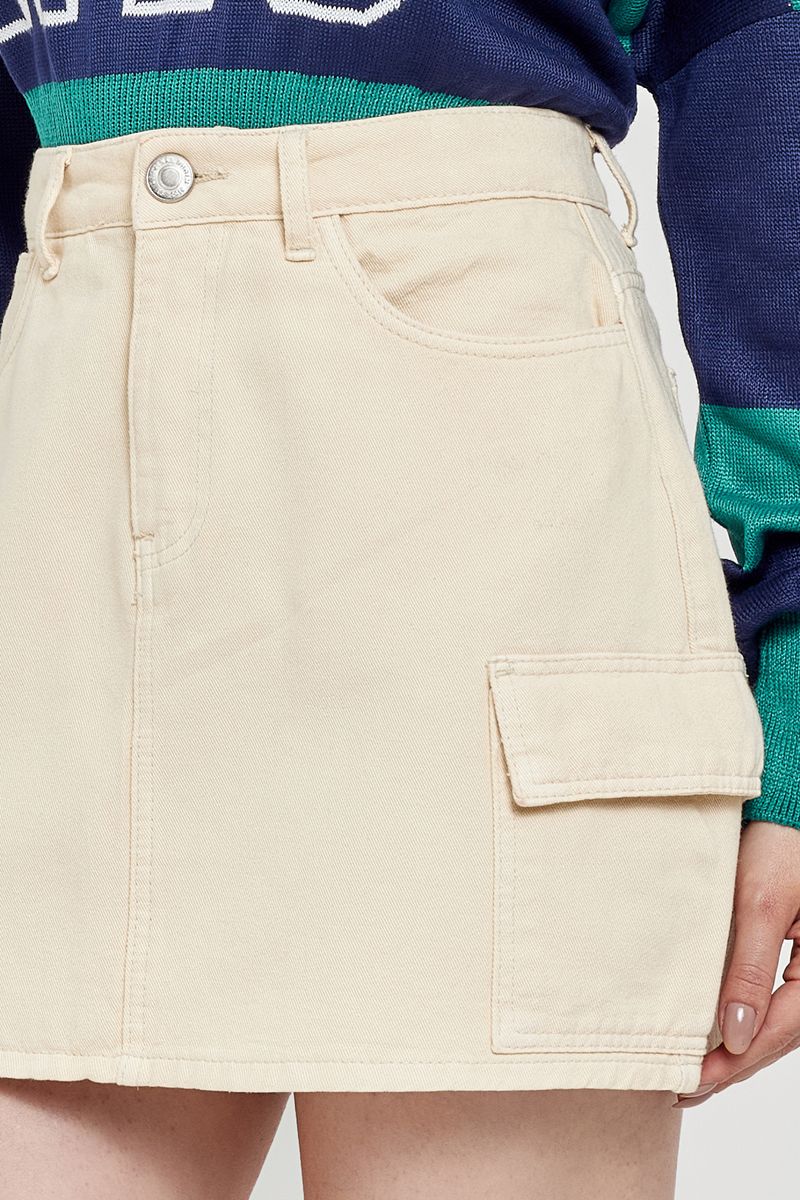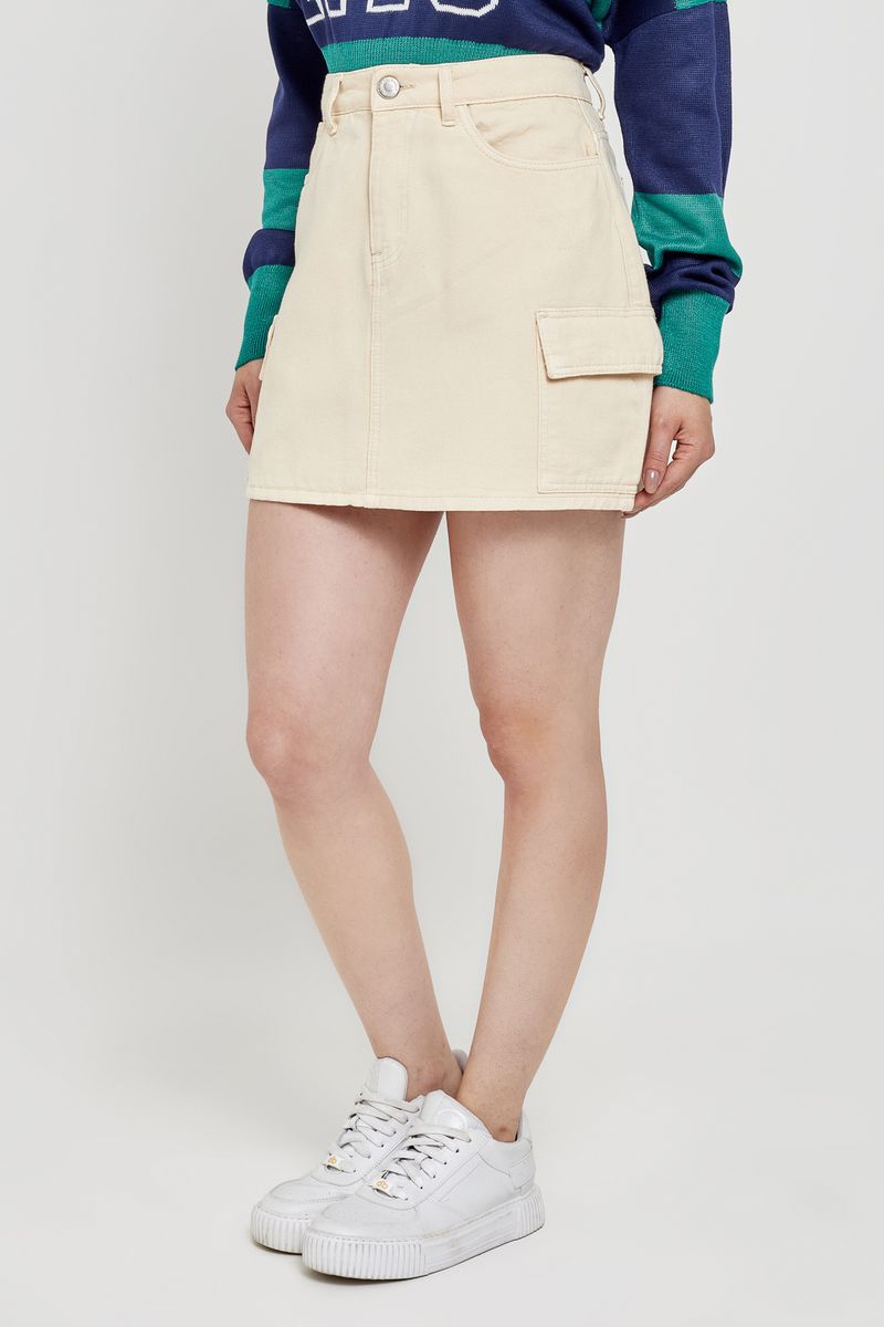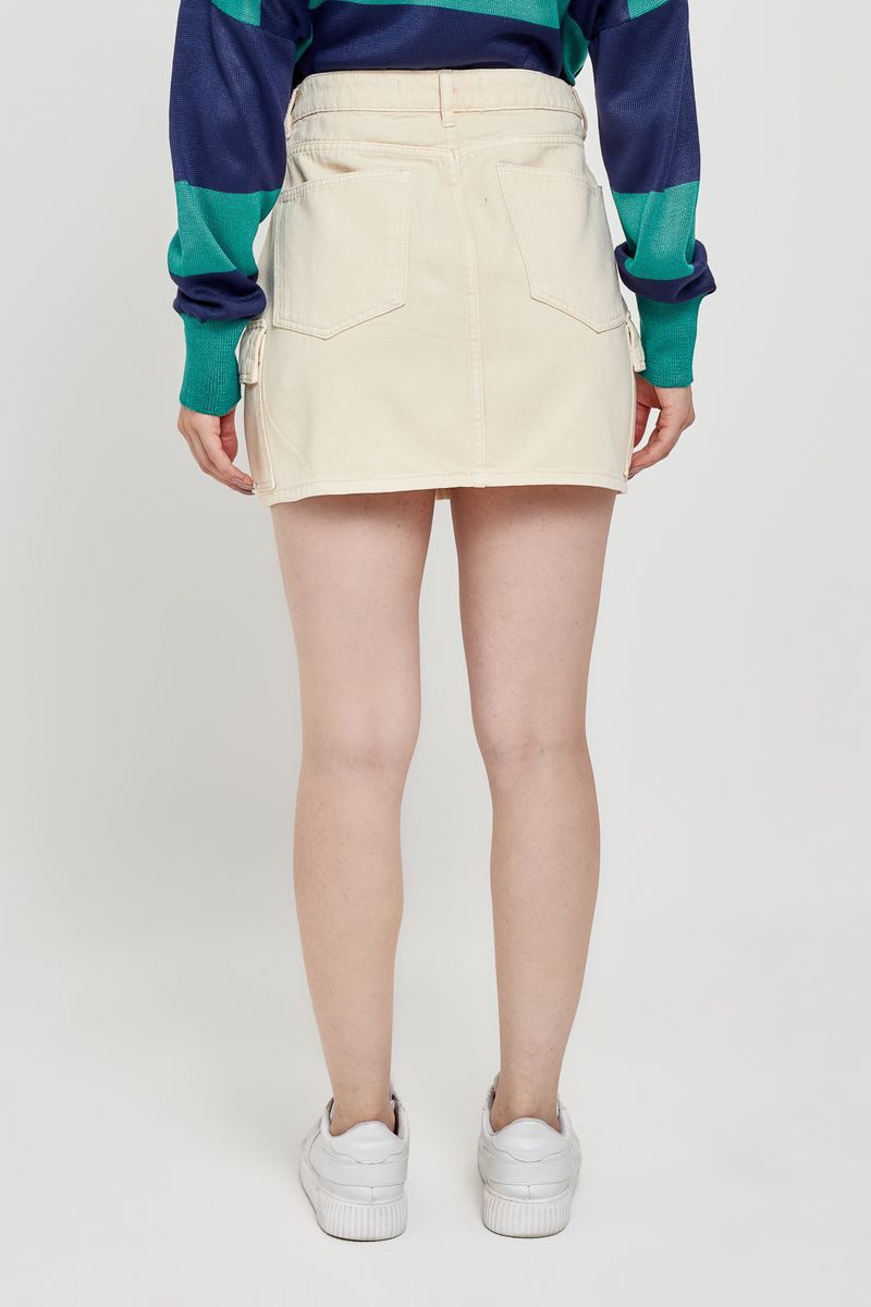 Saia feminina modelo cargo, confeccionada em sarja. Cor bege claro.