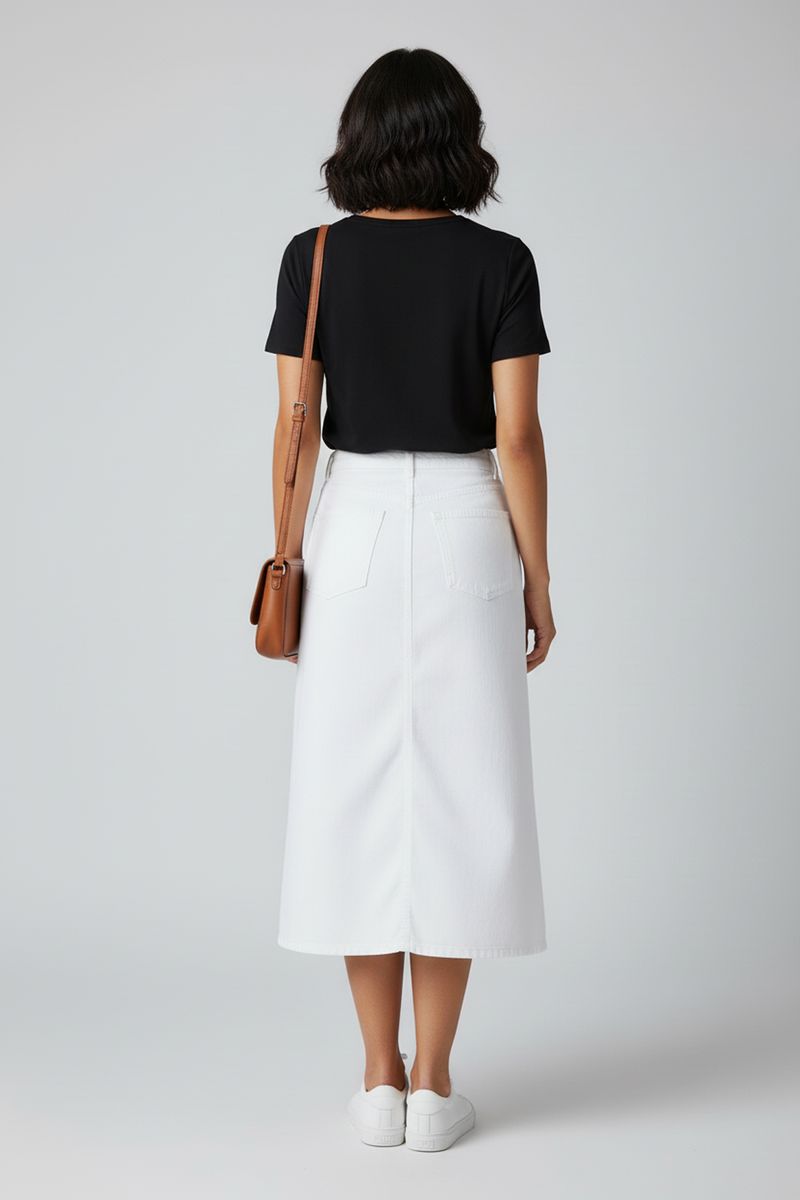 Combine a Saia Midi Feminina Off White de Sarja Casual Caedu com uma camiseta preta básica para um visual despojado, ou uma blusa de tecido leve para um toque mais sofisticado. Nos pés, tênis brancos trazem conforto e estilo, enquanto sandálias ou sapatilhas elevam a produção. Adicione uma bolsa carteiro para completar o look com praticidade e charme.