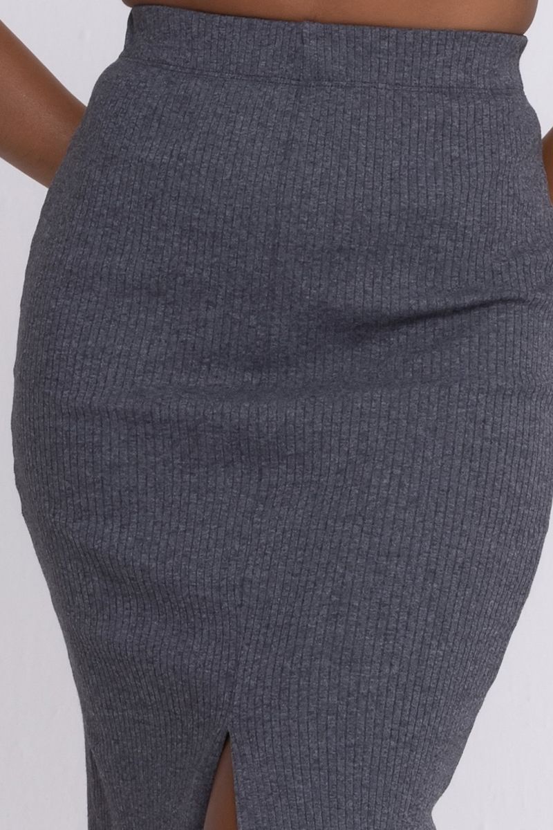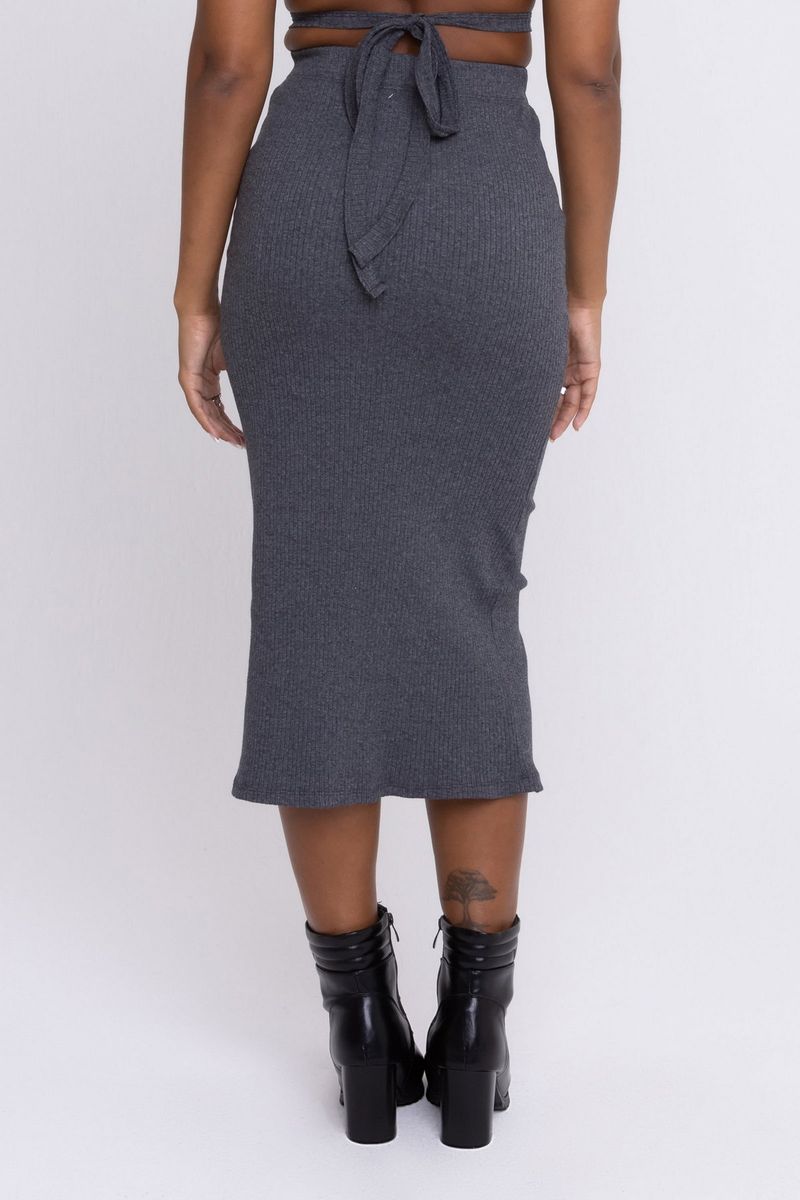 Saia midi em ribana cinza escuro com fenda e sem estampa. O comprimento midi refere-se à altura da peça que pode variar entre os joelhos e o tornozelo. É a escolha certa para quem busca um look elegante e estiloso.