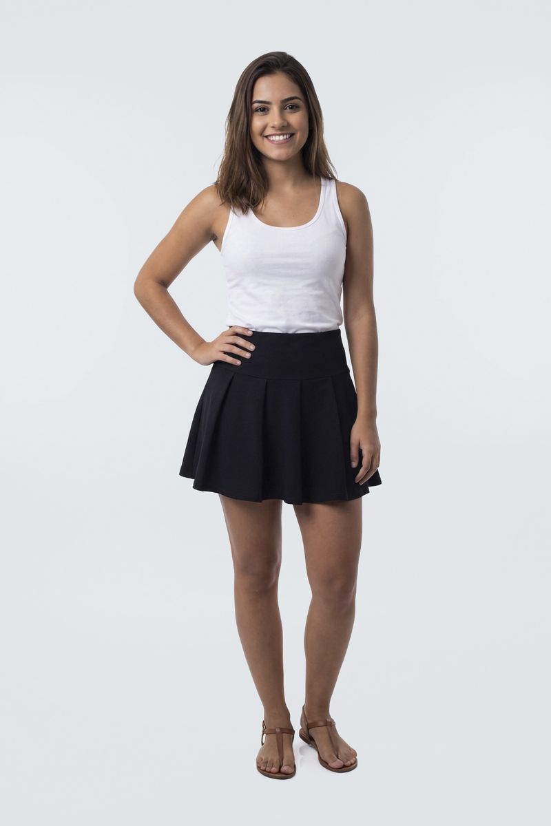 Combine sua Saia Plissada Curta Feminina Preta Fashion com uma regata branca lisa para um look casual e elegante, como visto na imagem. Para um estilo mais sofisticado, opte por blusas de seda ou camisas. Nos pés, sandálias rasteiras para o dia ou saltos para a noite. Adicione um blazer para um toque de formalidade ou uma jaqueta jeans para um visual despojado, criando looks completos e cheios de estilo.