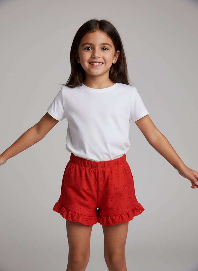 Combine o shorts vermelho com uma blusa branca lisa ou de cores neutras para um look casual e charmoso. Para um toque mais despojado, adicione um tênis branco. Complete com sandálias ou sapatilhas e acessórios como laços de cabelo para um visual completo e adorável.