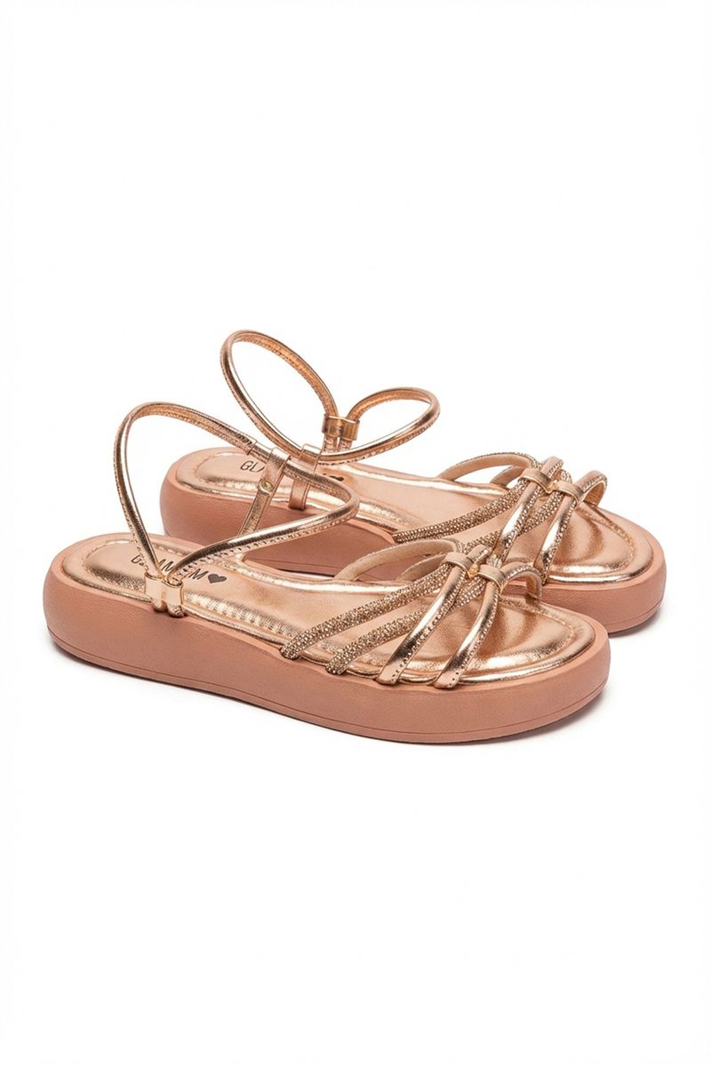 Desperte seu estilo com a Sandália Flatform Glamour Cobre Caedu! Com design jovem e tiras trançadas adornadas com brilho, esta sandália oferece conforto e um toque de sofisticação. Perfeita para quem busca moda e versatilidade em roupas Caedu.