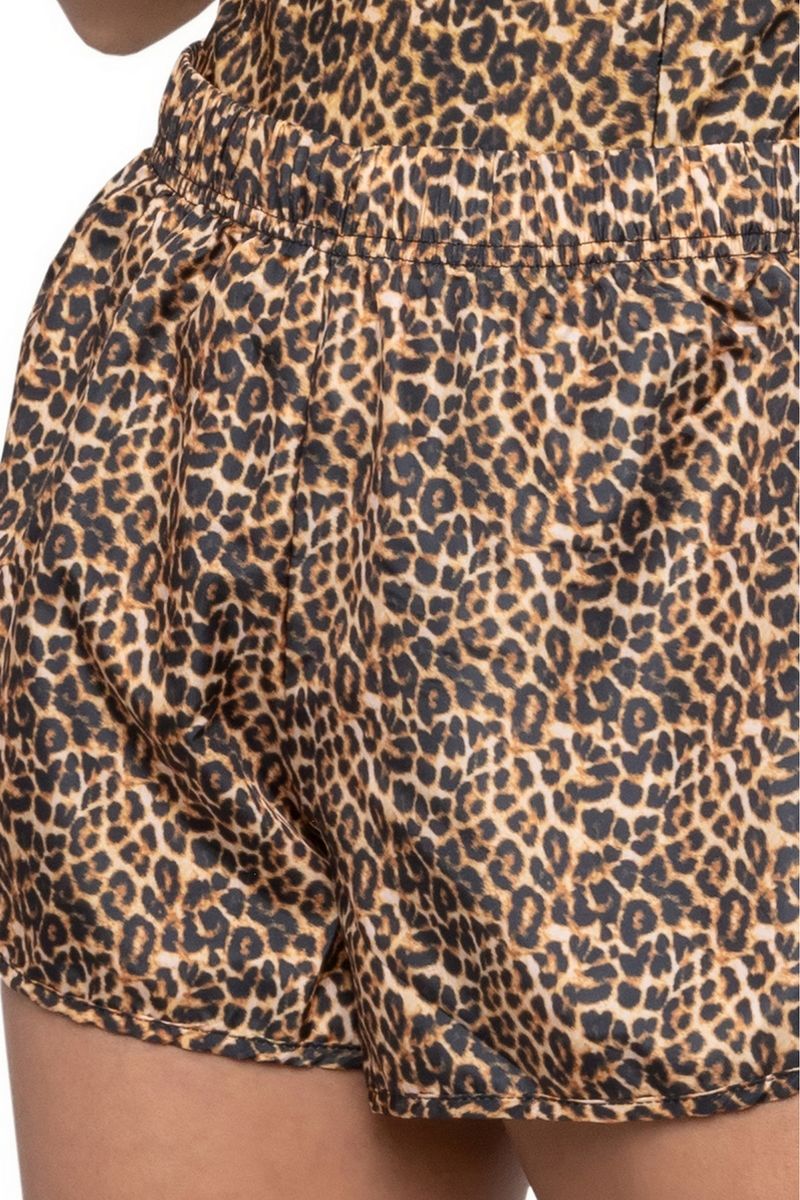 Saída de praia short com estampa de onça. Fresco e super confortável, o modelo oferece ótima respirabilidade ao corpo. Estiloso e cheio de charme, é perfeito para compor seus looks tropicais para curtir a praia e a piscina com muita elegância.