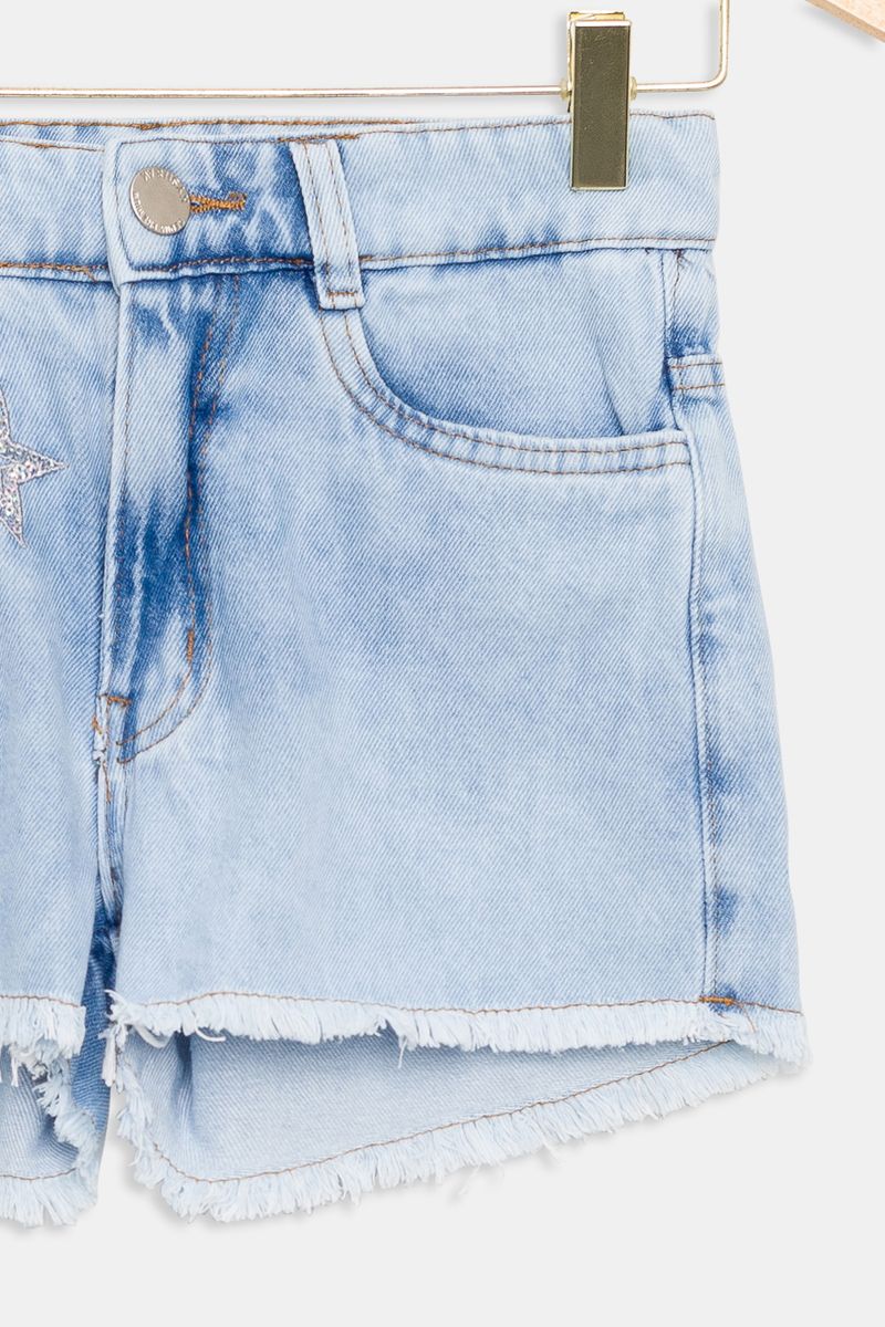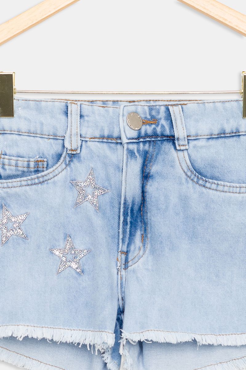 Detalhes: Bordado de estrela em lantejoulas/glitter prateado, azul claro desbotado, cintura com passadores, fechamento com botão metálico e zíper, bolsos frontais, bainha desfiada