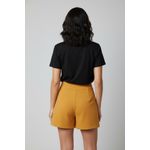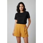 Combine o shorts com uma blusa de seda para um look mais chique, complementando com sandálias de salto e um blazer. Para um visual casual, opte por uma camiseta branca e tênis. Se preferir algo despojado, um cropped e rasteirinhas são ideais. Adicione acessórios dourados para realçar o tom amarelo mostarda e criar um look completo e cheio de moda.