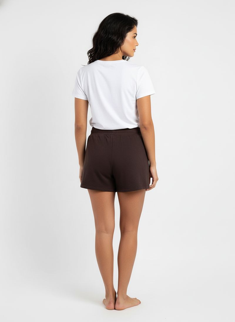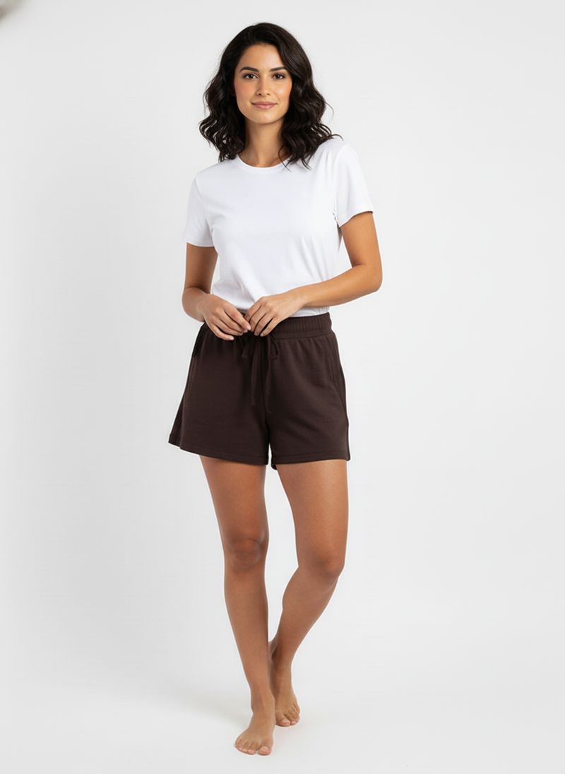Sinta o conforto premium do Shorts Feminino de Moletom Caedu. Em tom marrom escuro, este shorts de moletinho possui cós elástico com cordão ajustável e bolsos laterais, ideal para um visual casual e despojado com muito estilo.