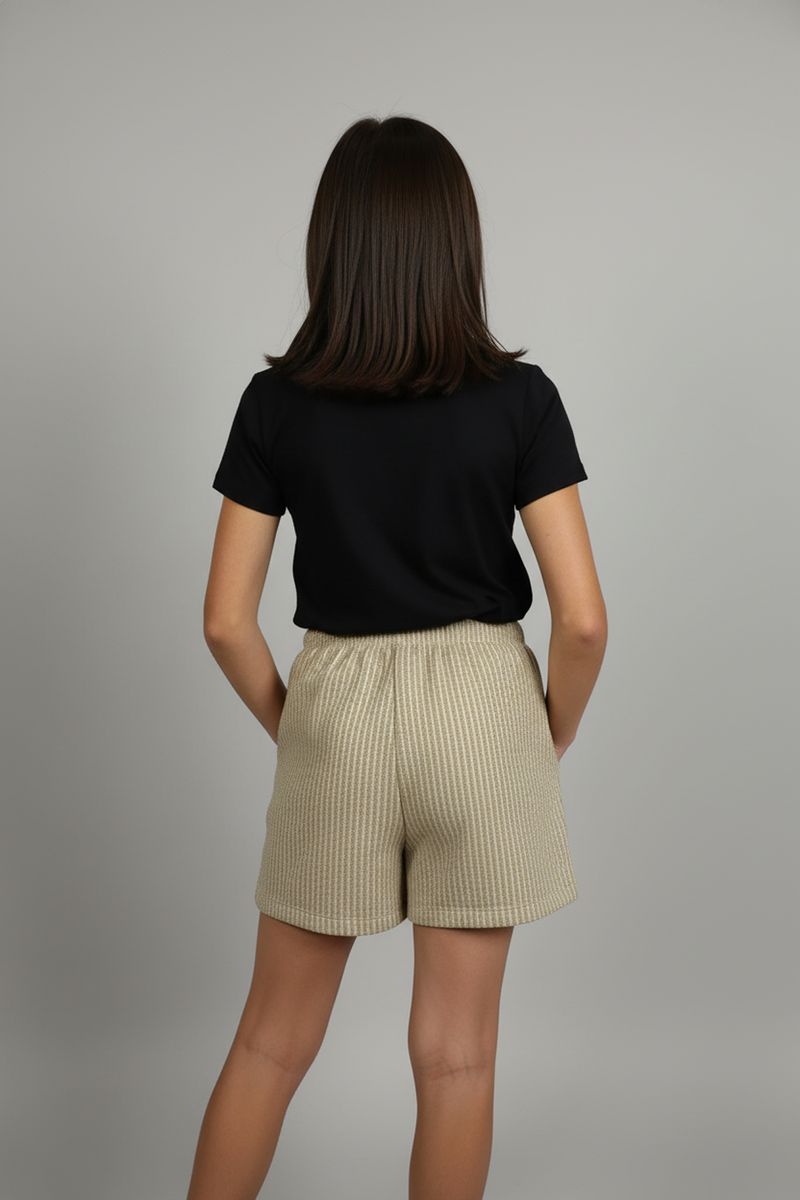 Detalhes: Cós elástico, cordão ajustável, padrão de listras verticais finas