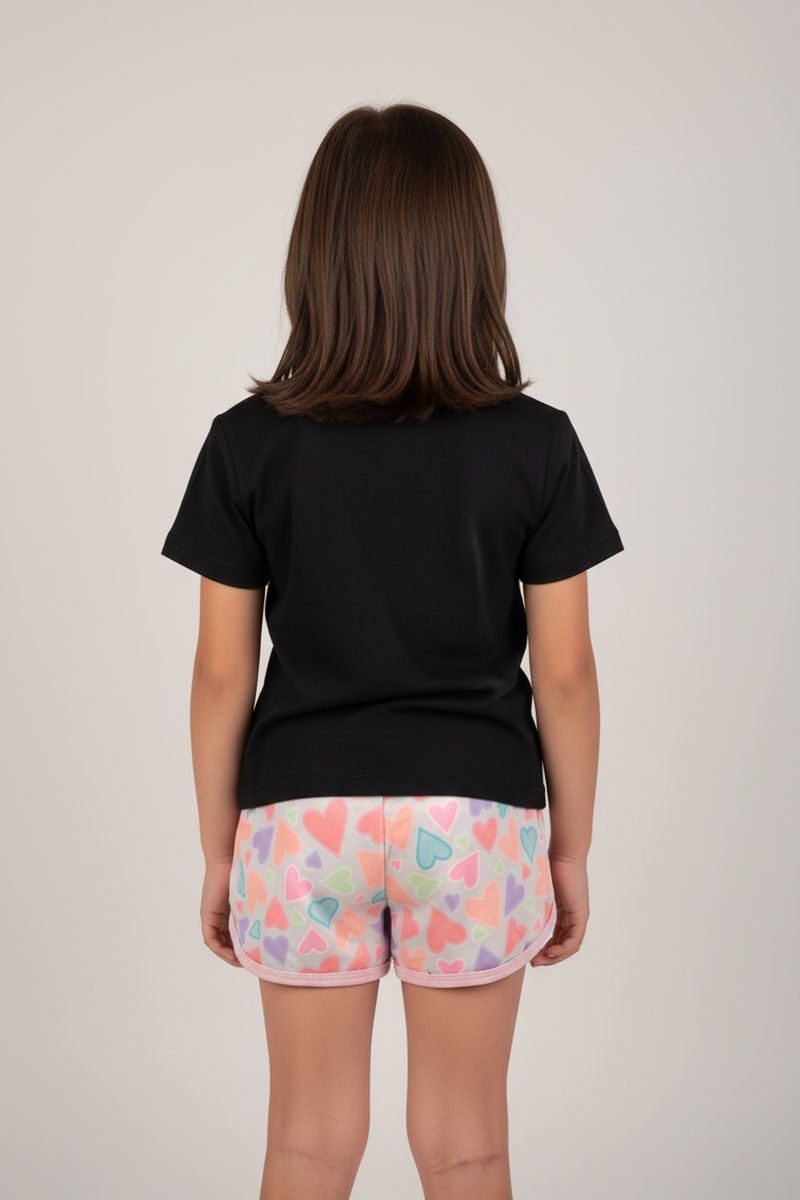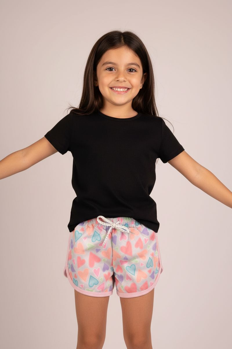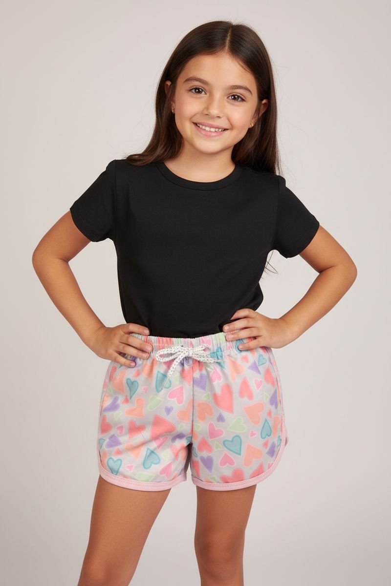 Combine o shorts com blusas lisas em tons de preto, branco ou pastel para um look equilibrado. Para um toque divertido, adicione uma regata colorida. Complete o visual com tênis confortáveis ou sandálias charmosas e acessórios como laços de cabelo, criando um conjunto alegre e moderno.