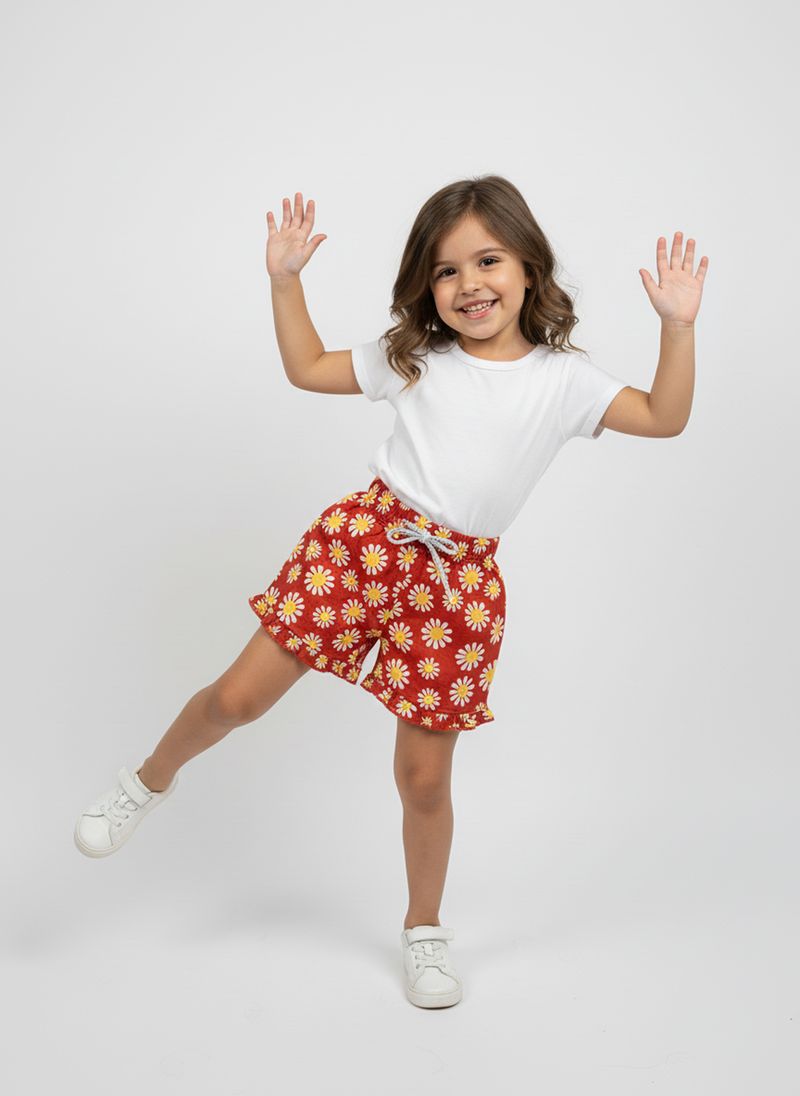 O Shorts Infantil Caedu Margaridas Vermelhas com Babado oferece conforto e estilo. Em TACTEL, é leve e vibrante com estampa de margaridas e babado. Essencial na moda infantil Caedu, garante charme e liberdade para as pequenas fashionistas.