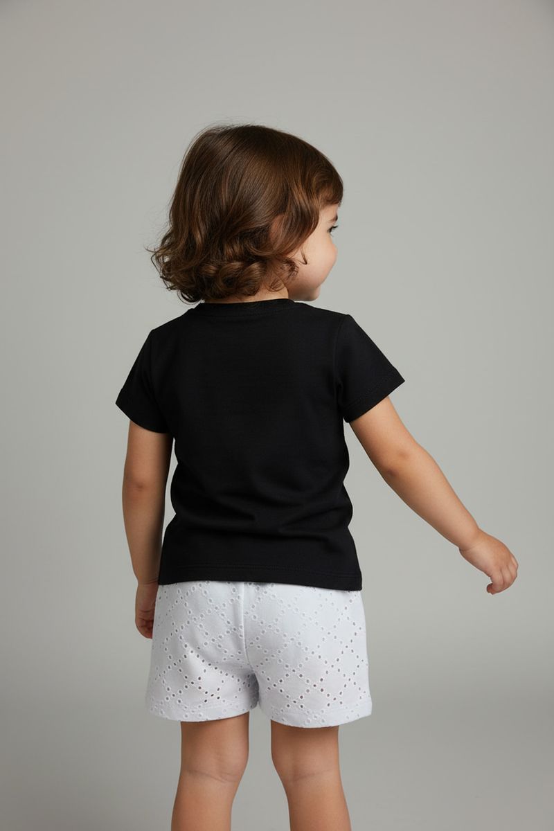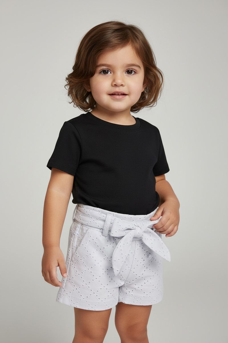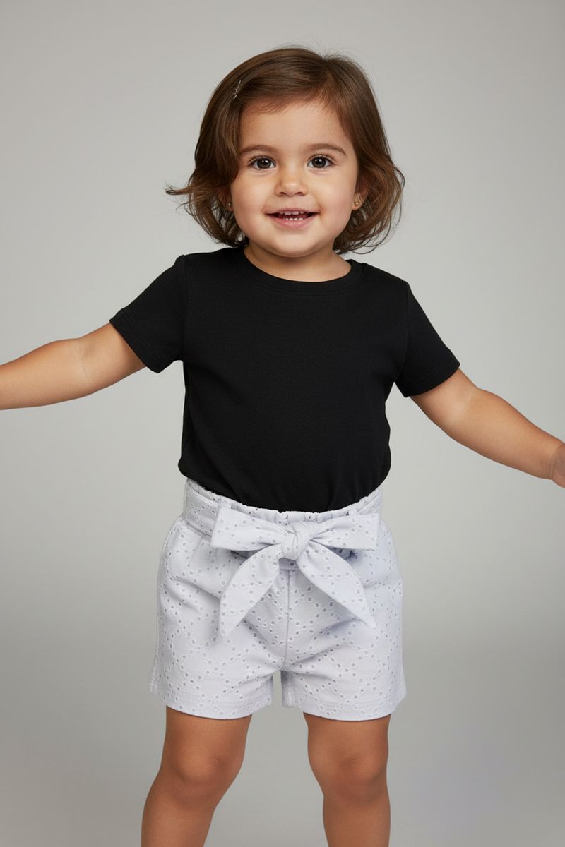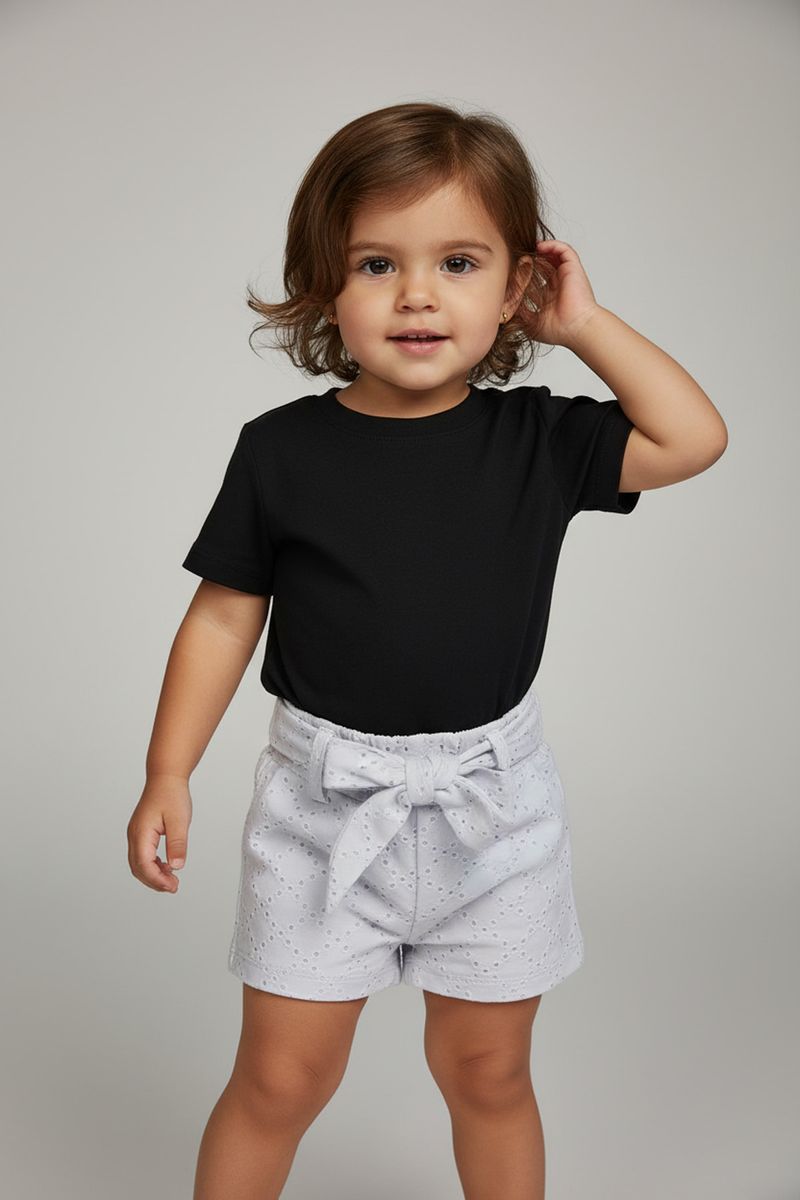 Combine o Shorts Laise Infantil Branco com uma blusa preta para um contraste moderno ou blusas coloridas para um toque divertido. Complete o look com sandálias rasteirinhas para um passeio ou sapatilhas para um evento especial. Adicione acessórios de cabelo para um charme extra e crie looks versáteis.