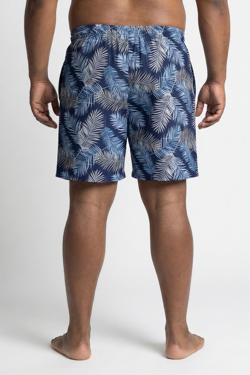 O Shorts Masculino Tactel Estampa Tropical Caedu oferece conforto e estilo. Com estampa de folhas azuis e marinho, é feito em Tactel 100% poliéster. Cós elástico e cordão ajustável garantem caimento ideal para a moda masculina.