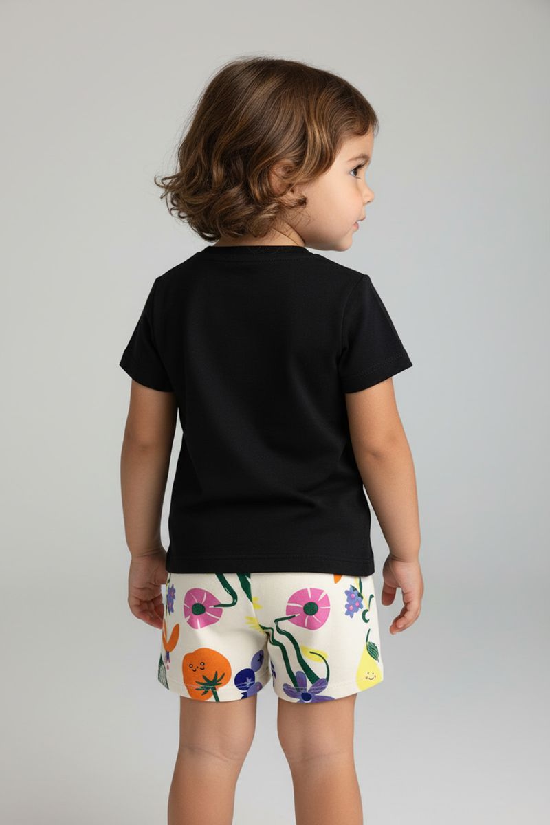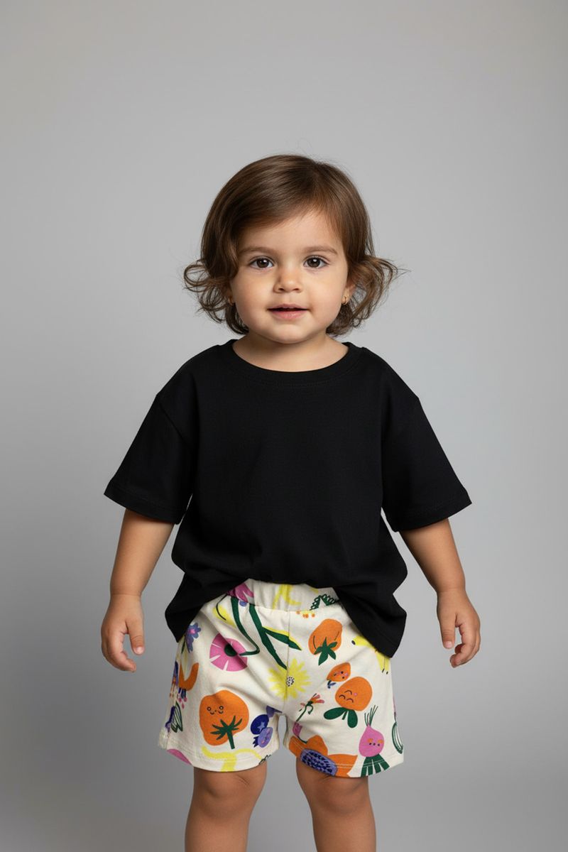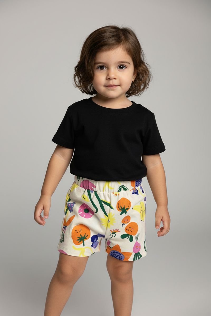 Crie looks encantadores combinando este shorts estampado com uma blusa preta lisa para um visual equilibrado. Para um toque mais ousado, opte por blusas em tons de rosa, laranja ou verde que realcem a estampa vibrante. Complete o visual com sandálias coloridas ou tênis confortáveis, garantindo estilo e praticidade para sua menina.