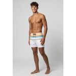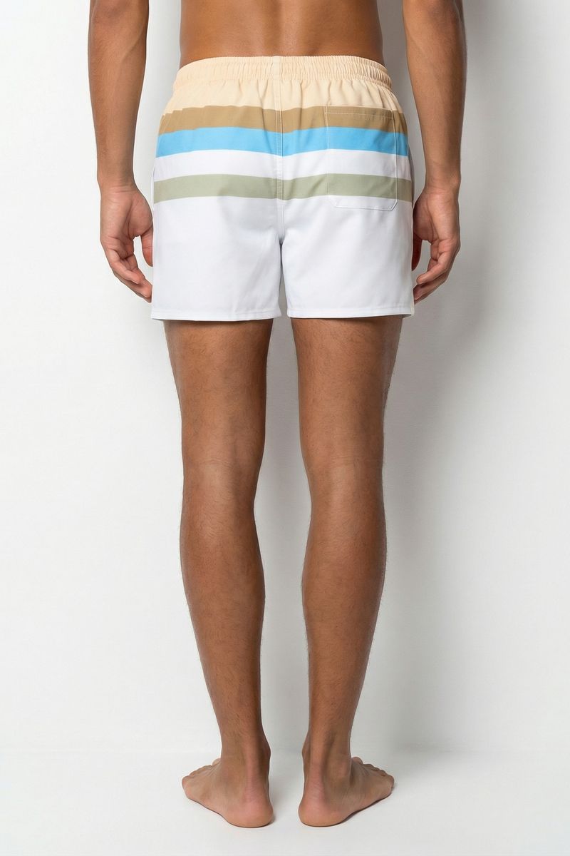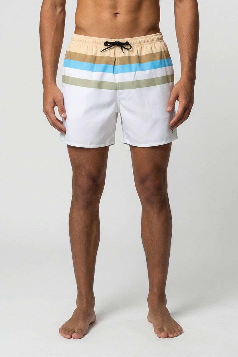 O Shorts de Banho Masculino Listrado Cores de Verão Off White Caedu oferece conforto e secagem rápida. Em tactel com elastano, possui listras coloridas e cós elástico para ajuste ideal. Sua roupa de moda praia.