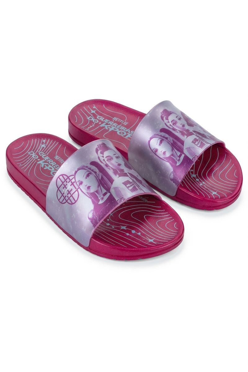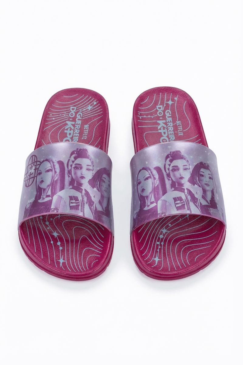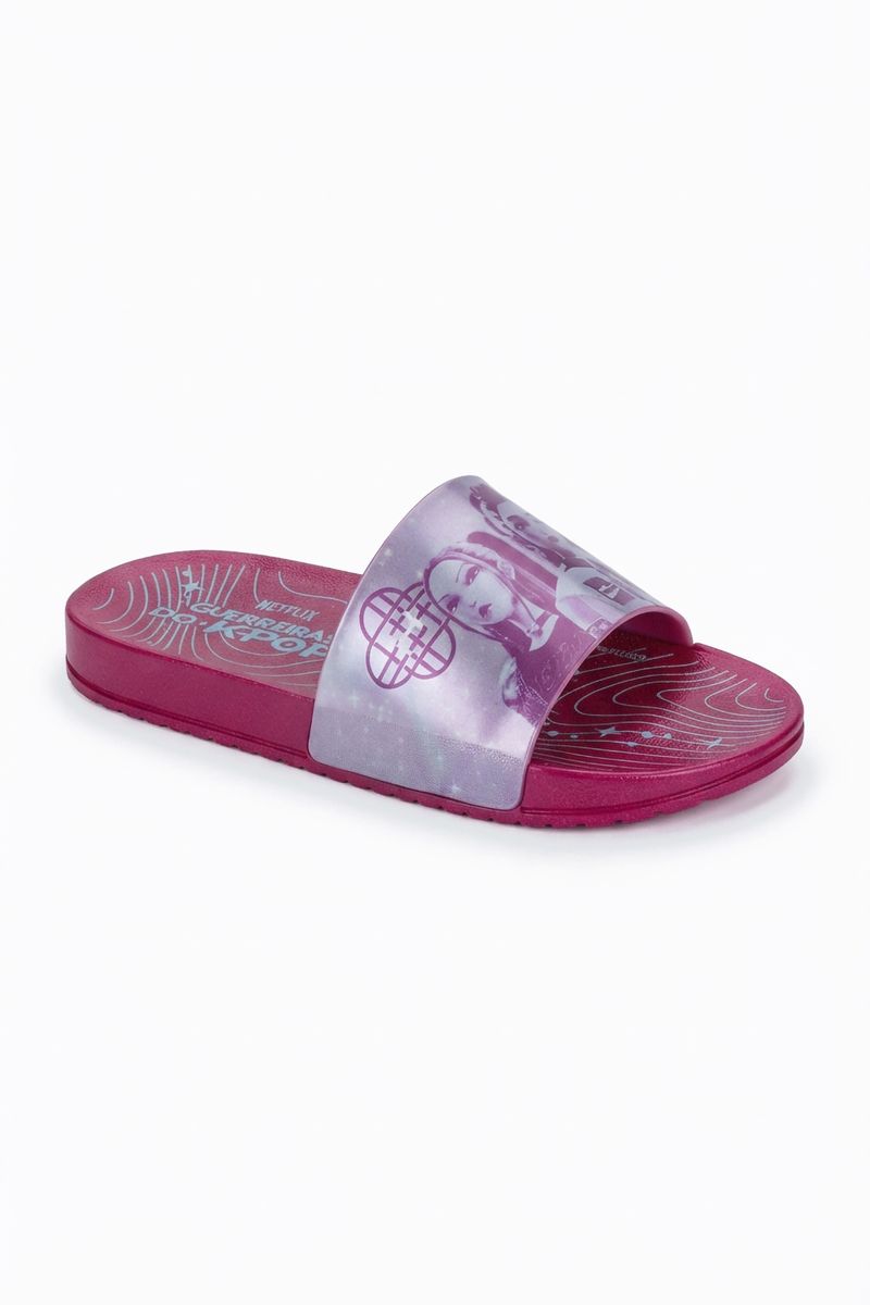 O Slide Feminino Caedu Guerreiras K-Pop Netflix Rosa combina conforto e estilo para meninas. Com design vibrante em tons de rosa e roxo, destaca a estampa exclusiva das Guerreiras K-Pop, ideal para expressar sua personalidade com a moda Caedu.