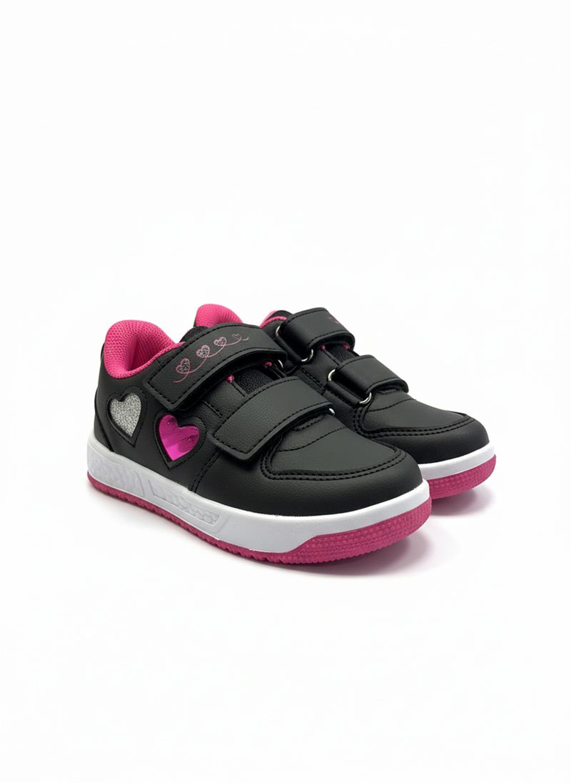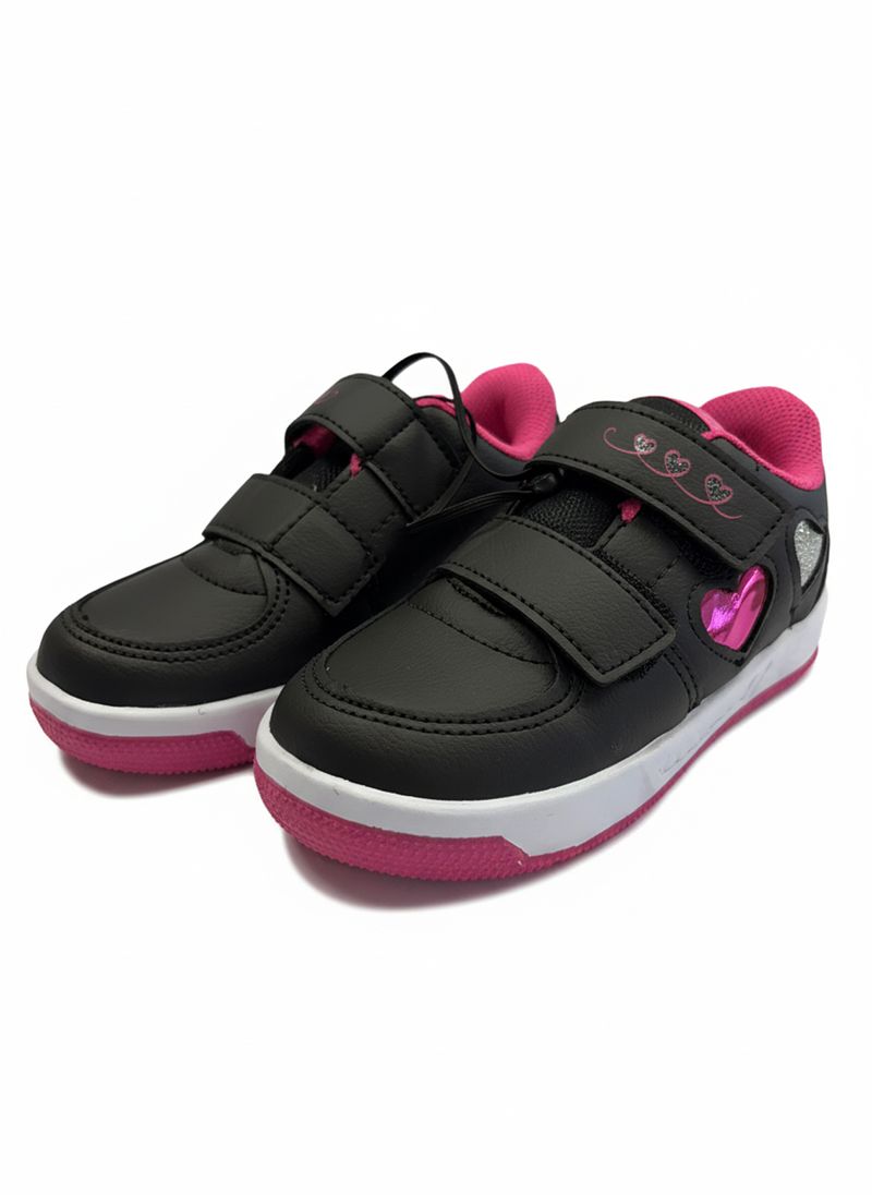 O Tênis Infantil Menina Caedu Corações Glitter é perfeito para as pequenas que amam brilho e conforto. Com design encantador em preto e pink, detalhes de corações com glitter e prático fecho em velcro, este calçado oferece segurança e estilo para cada passo. A sola de borracha garante durabilidade e aderência.