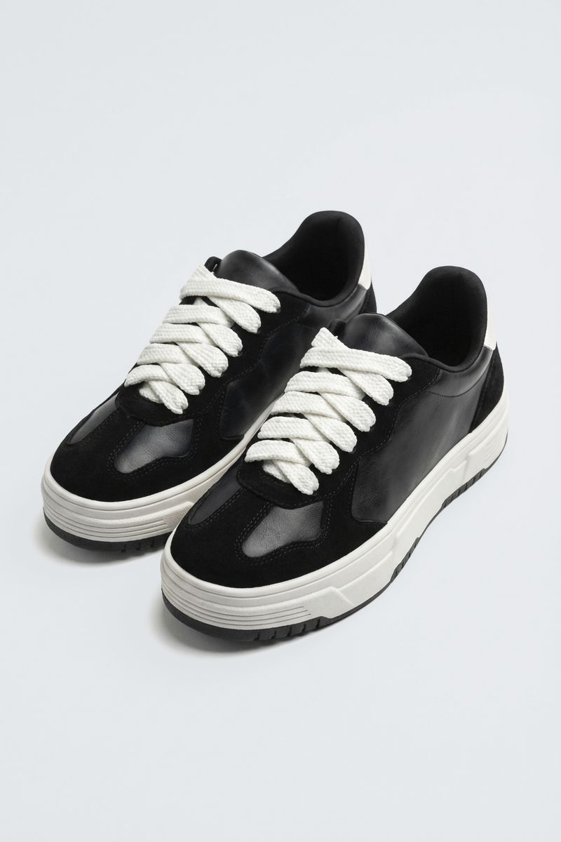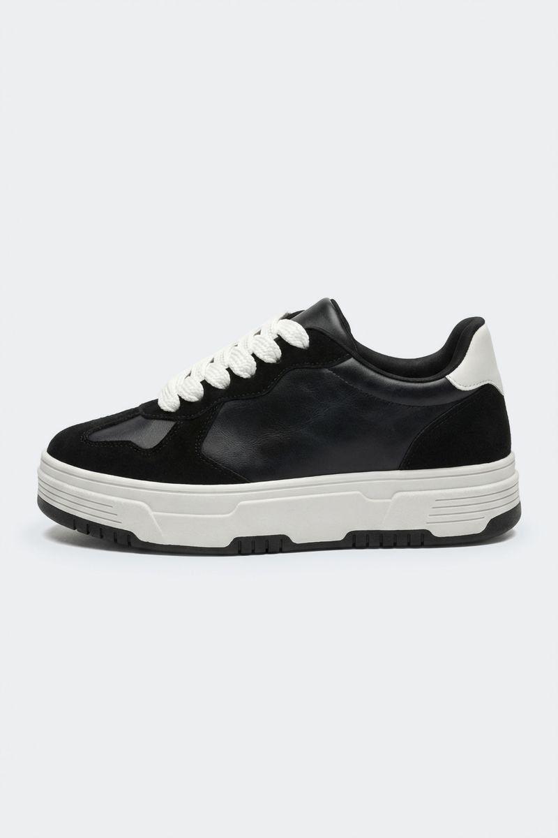 Eleve seu estilo com o Tênis Plataforma Dupla Onda Caedu. Com design moderno em preto e branco, cadarços largos e sola robusta, este calçado oferece conforto e um toque de moda para suas roupas. Perfeito para quem busca um visual autêntico e cheio de personalidade.