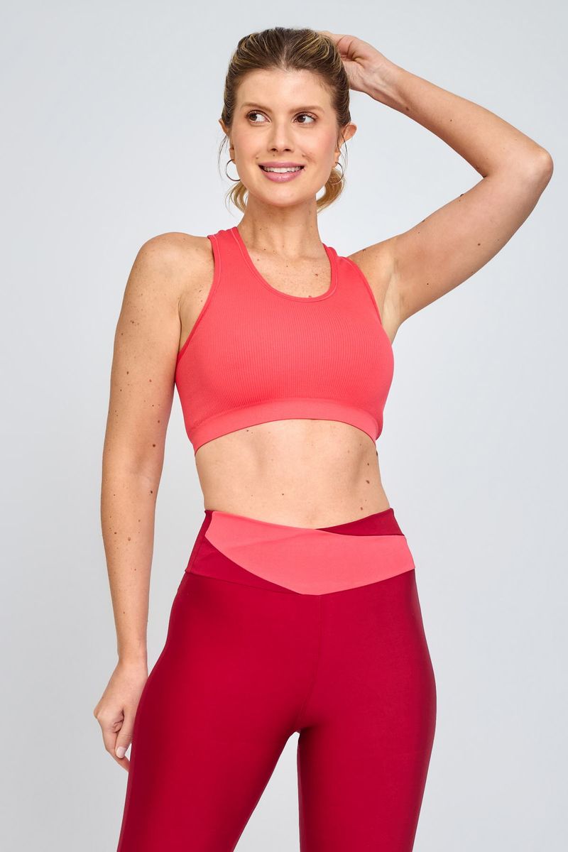 Top esportivo sem costura feminino cor coral, para quem busca conforto e praticidade.