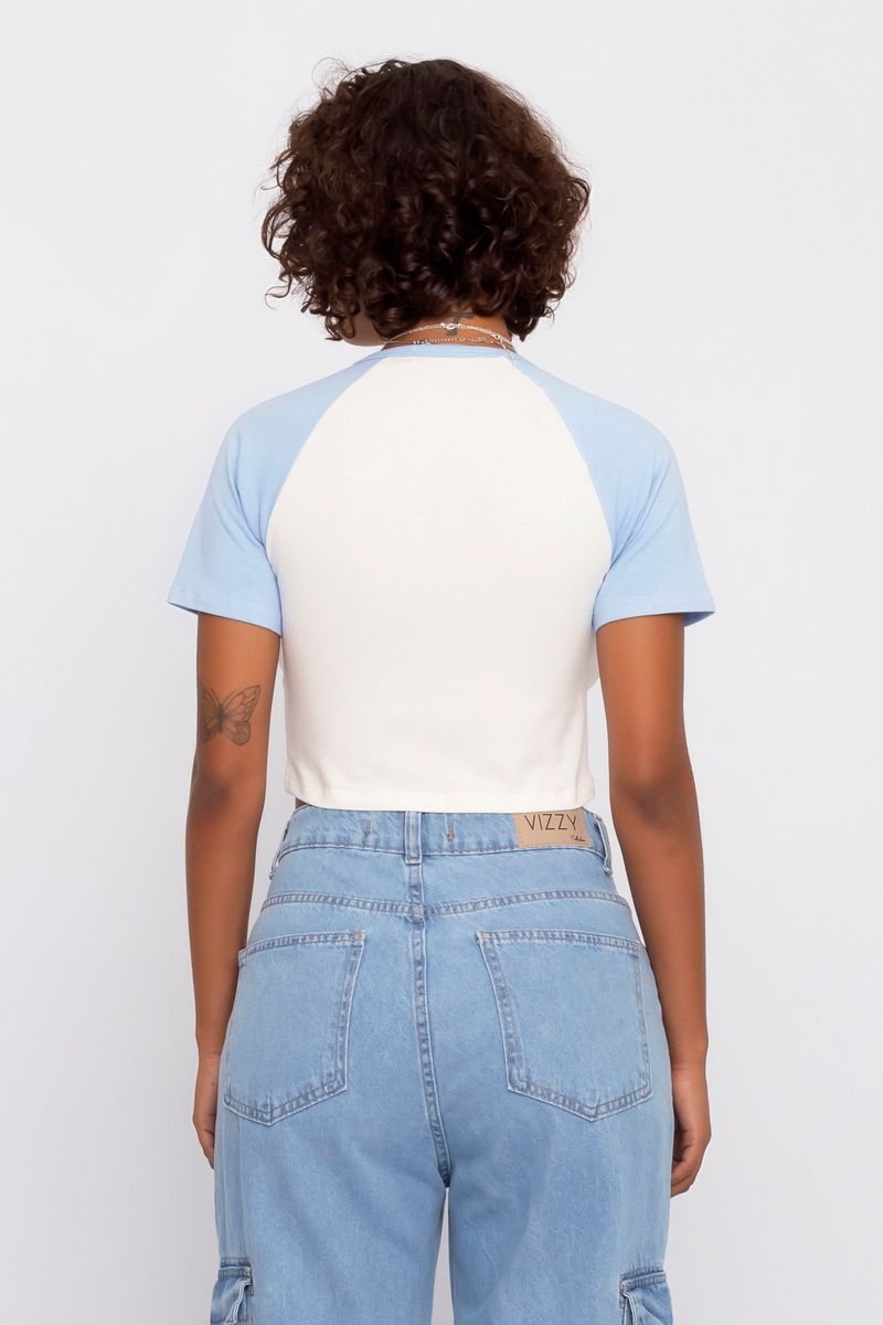 VestuárioOfertasFemininoNovidadesTopsFemininoBlusa Cropped Feminina Raglan com Estampa College Off White e Azul
