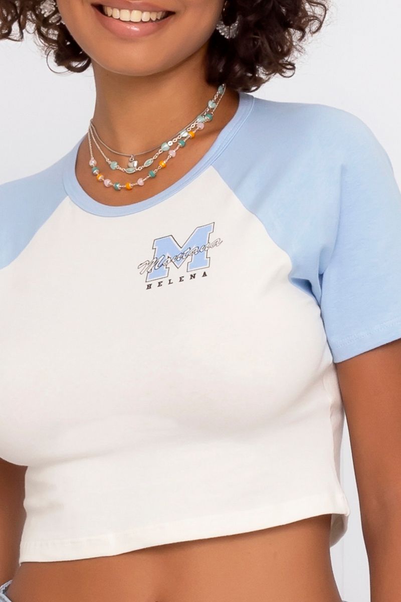 Blusa Cropped Feminina Raglan com Estampa College Off White e Azul