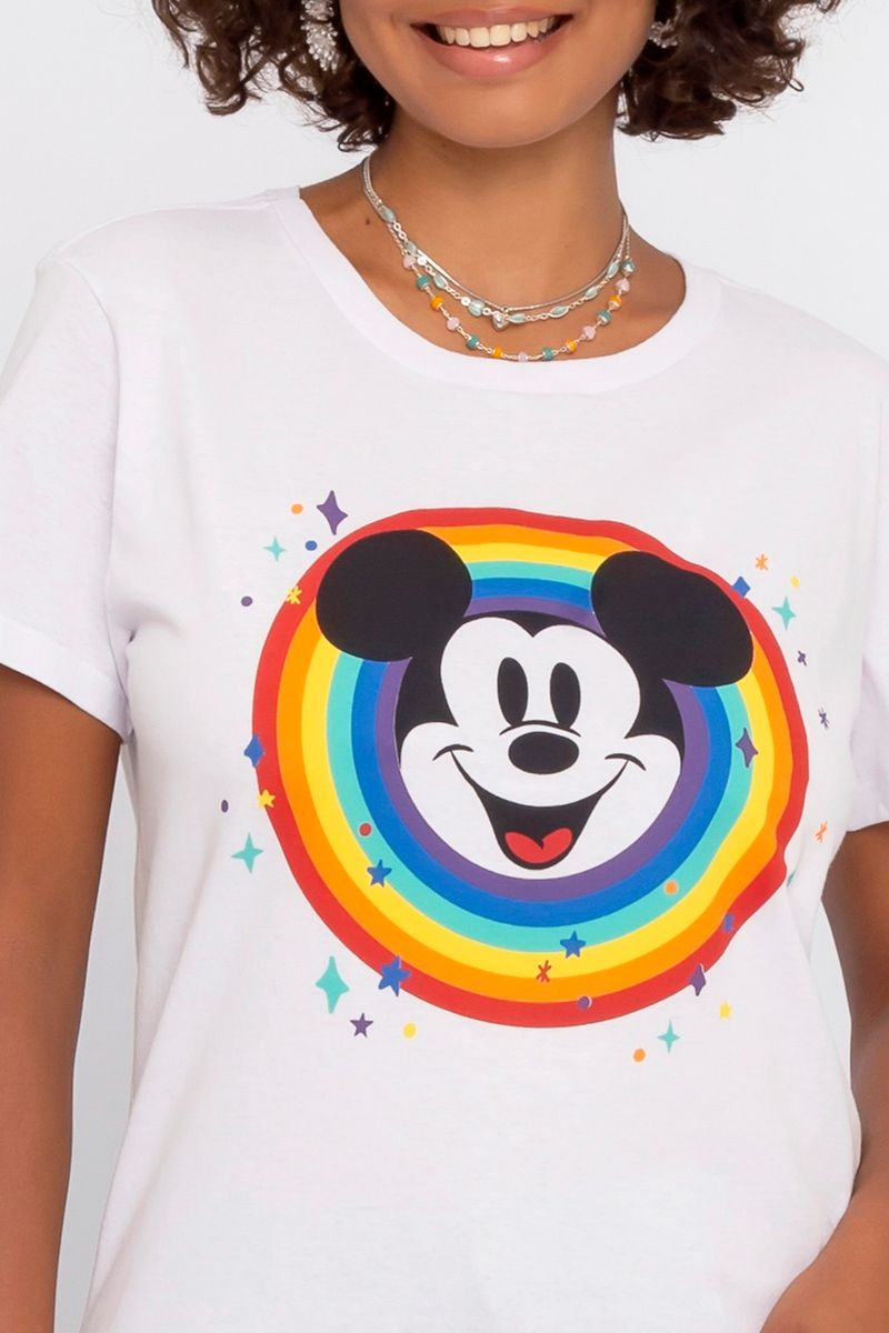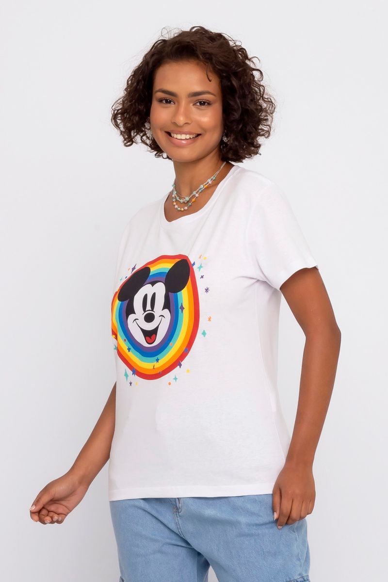 VestuárioOfertasFemininoNovidadesTopsFemininoClube Cartão CaeduBlusa Feminina com Estampa Mickey Arco Íris Branca