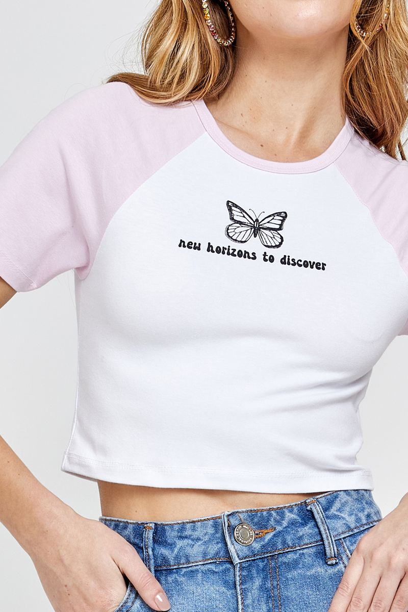 Detalhes: Estampa de borboleta e frase "new horizons to discover"
