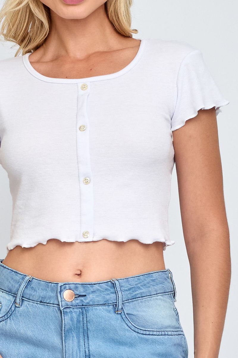 Descubra o Top Feminino com Botões Off White Caedu, a peça ideal para um visual simples e elegante. Confeccionado em ribana 100% poliéster, oferece conforto e estilo. Perfeito para quem busca moda e roupas de qualidade com preço bom.