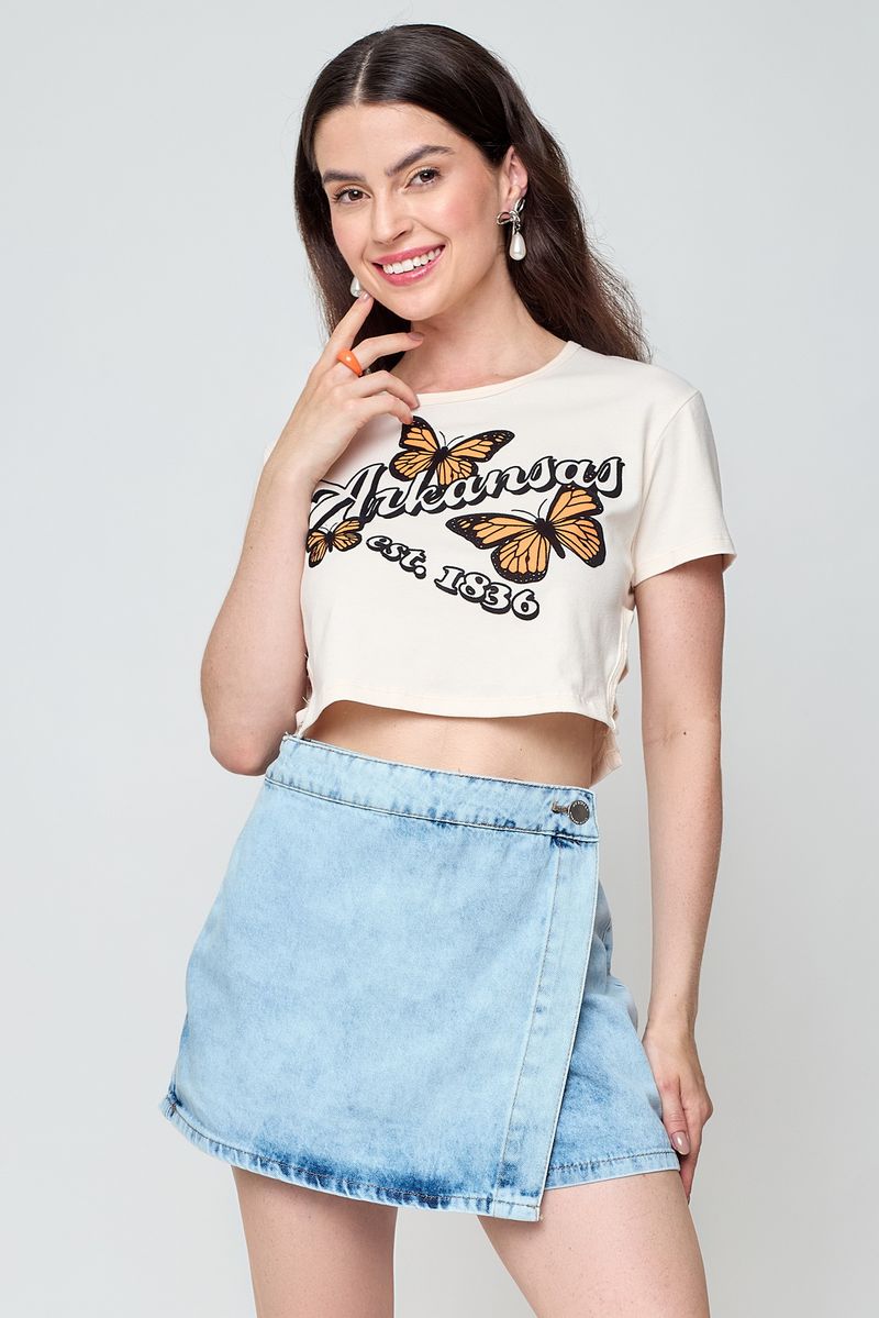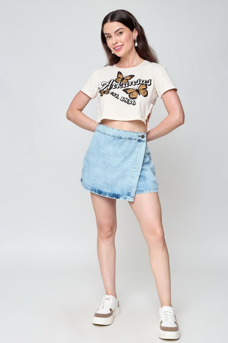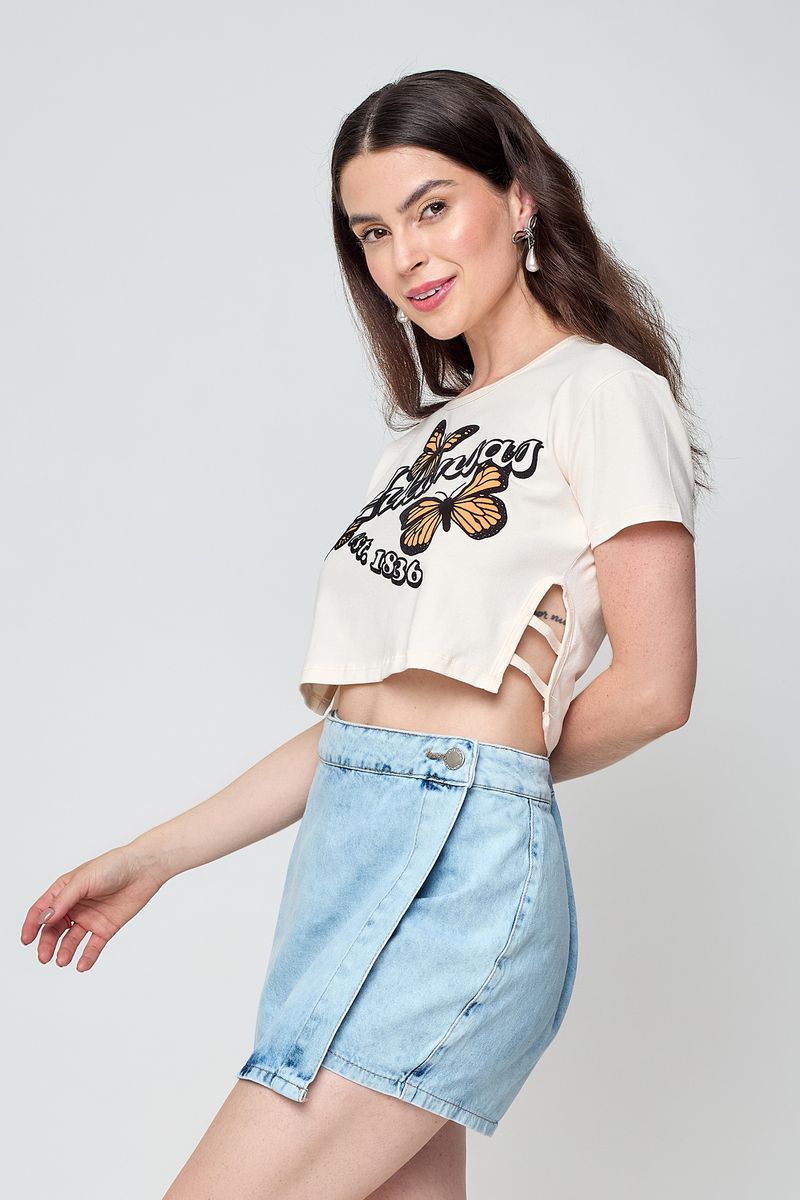 O Top Feminino Romântico Borboletas Off White Caedu é ideal para um visual delicado e confortável. Com estampa de borboletas e cotton (96% algodão, 4% elastano), oferece moda. Peça charmosa e barata!