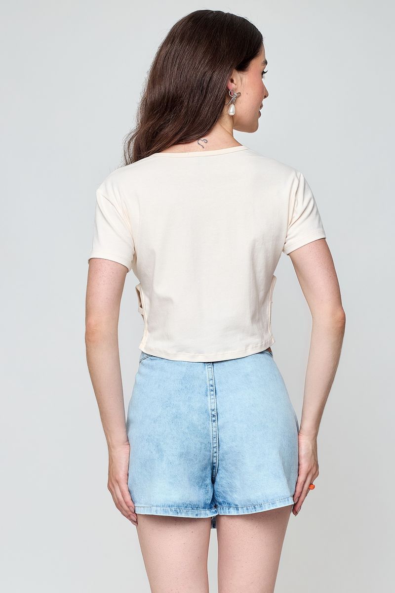Combine seu top com calças jeans de cintura alta para um visual despojado, ou com saias midi para um toque romântico. Para os pés, tênis brancos ou sandálias rasteiras. Adicione uma jaqueta jeans para um estilo casual e moderno, perfeito para diversas ocasiões.