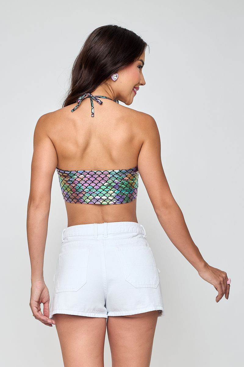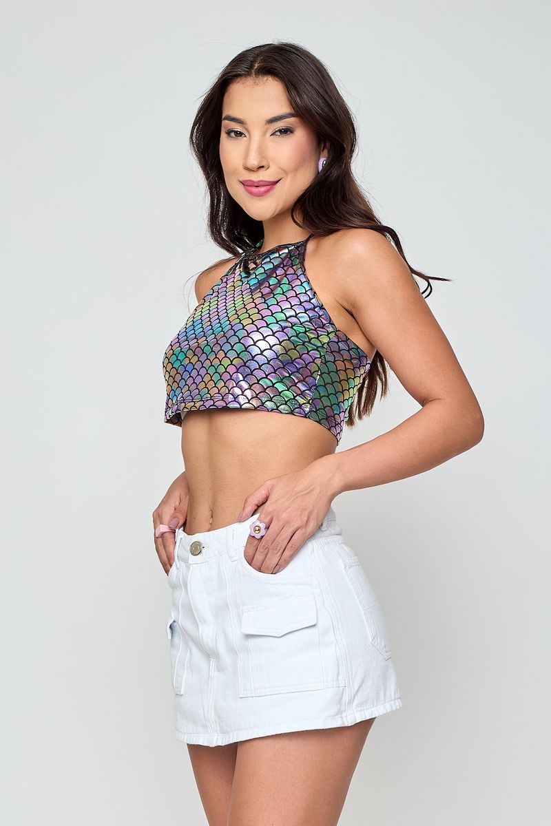 Combine o Top Sereia Multicor com shorts jeans de cintura alta para um visual casual e moderno. Para um toque mais elegante, use com uma saia branca fluida e sandálias. Complete com tênis brancos para um look despojado ou rasteirinhas para um passeio leve. Adicione acessórios simples para realçar o charme da estampa.