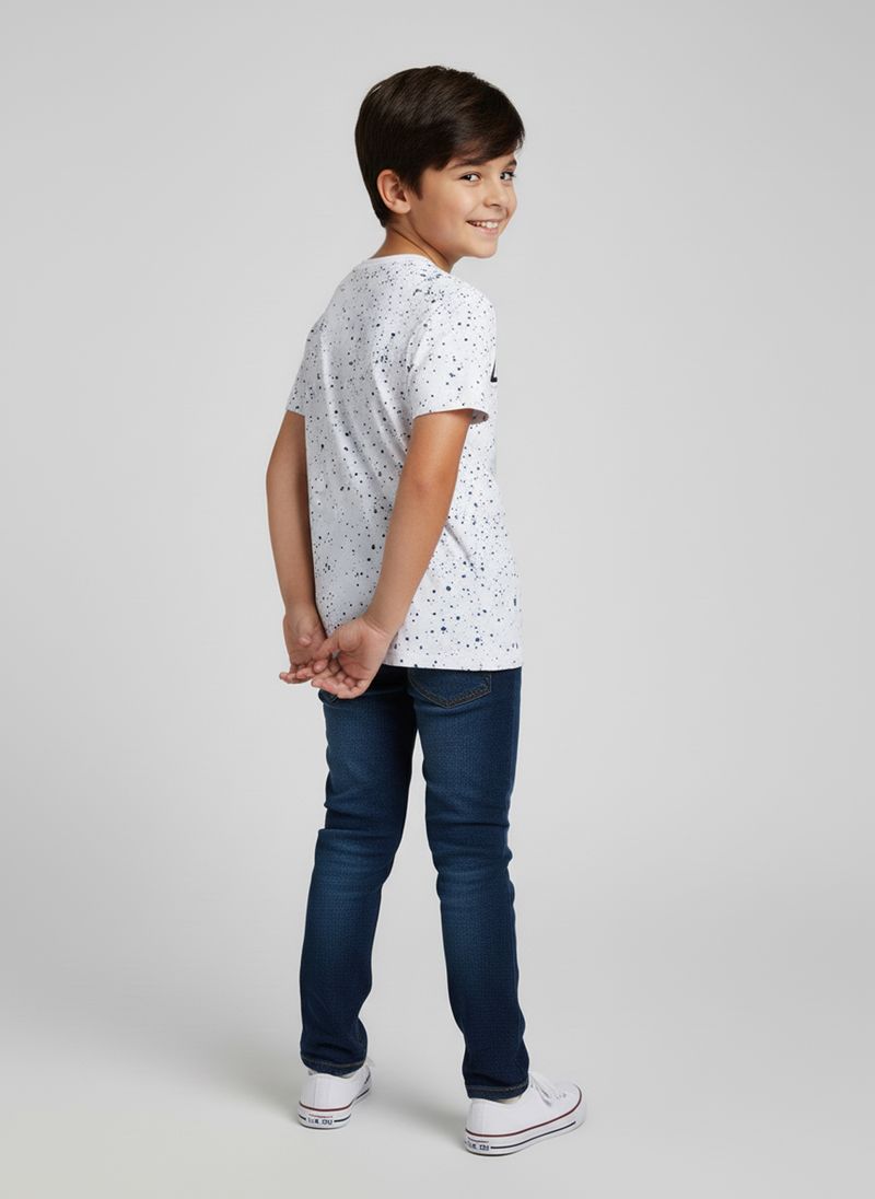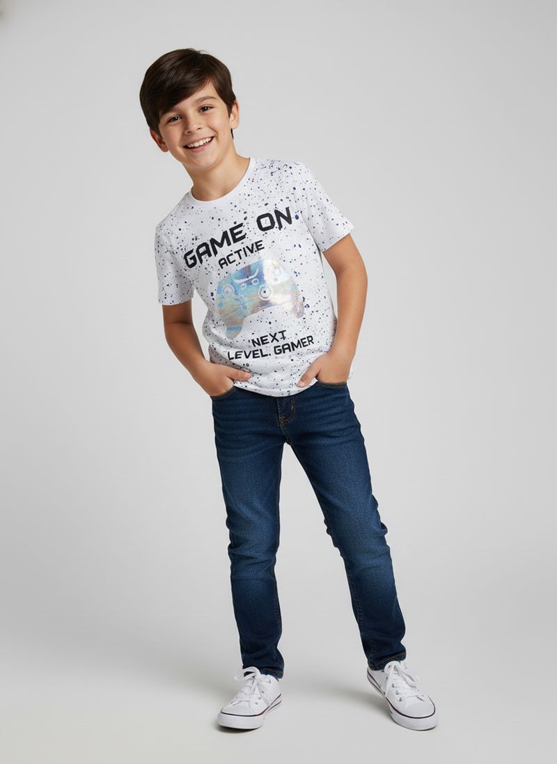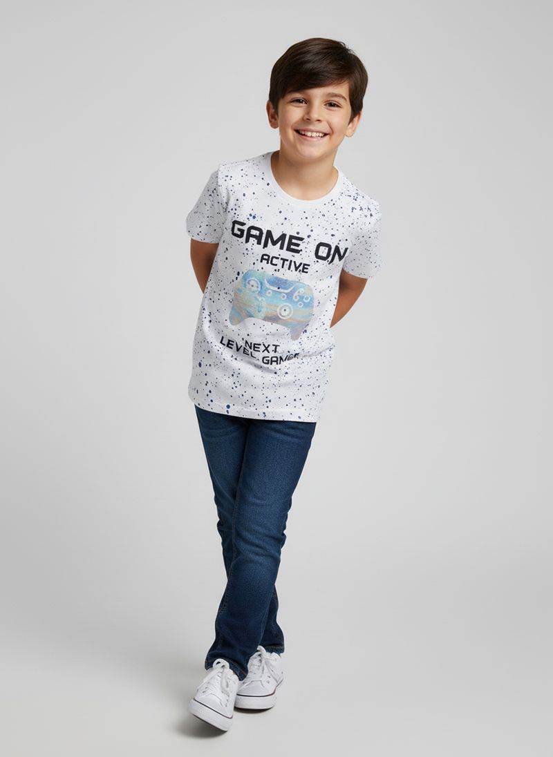 A Blusa Infantil Gamer 'Game On' Caedu é perfeita para os pequenos aventureiros. Confeccionada em 100% algodão e meia malha, oferece conforto e liberdade. Com estampa de controle iridescente e detalhes salpicados, é a roupa infantil ideal para um visual cheio de energia.