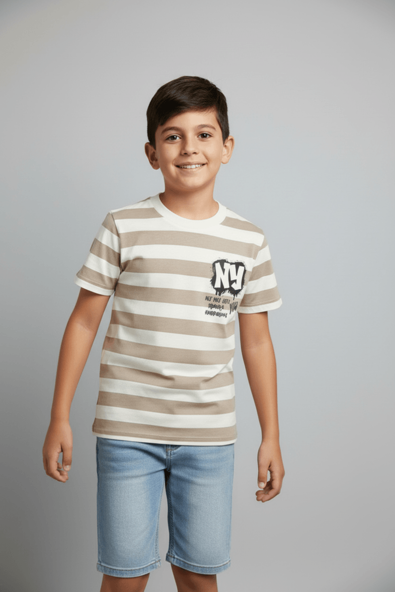 A Camiseta Infantil Masculina Listrada NY Algodão Gola Redonda Caedu oferece conforto e estilo. Em 100% algodão de meia malha, com design listrado e estampa NY, é a roupa ideal para os meninos. Qualidade Caedu.