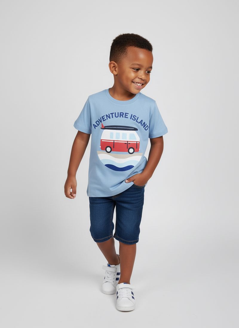 A Camiseta Infantil Caedu Adventure Island Kombi Surf em azul claro é perfeita para os pequenos exploradores. Confeccionada em 100% algodão de meia malha, oferece conforto e liberdade para todas as aventuras. Seu design vibrante com uma kombi e prancha inspira a imaginação e o espírito livre, ideal para a moda infantil da Caedu.