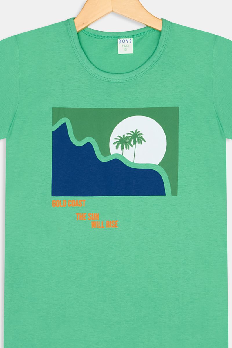 Descubra o Top Malha Infantil Caedu, perfeito para os pequenos aventureiros! Confeccionado em 100% algodão, oferece máximo conforto e liberdade. Com estampa exclusiva de paisagem 'Gold Coast' e palmeiras, este top verde vibrante é a escolha ideal para um look cheio de estilo e energia. Uma roupa que inspira diversão!