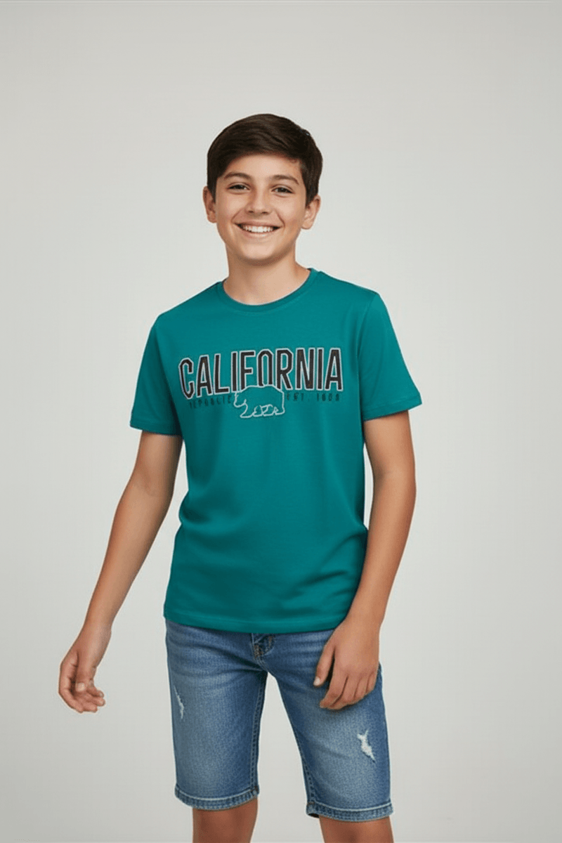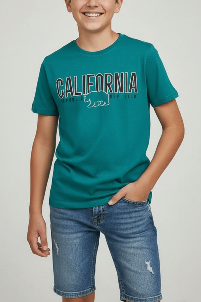 A Camiseta Juvenil Masculina Caedu oferece conforto e estilo para o dia a dia. Confeccionada em 100% algodão e meia malha, garante um toque suave. Com estampa vibrante California Bear e manga curta, é a roupa infantil ideal para um visual moderno. Encontre na loja virtual Caedu.