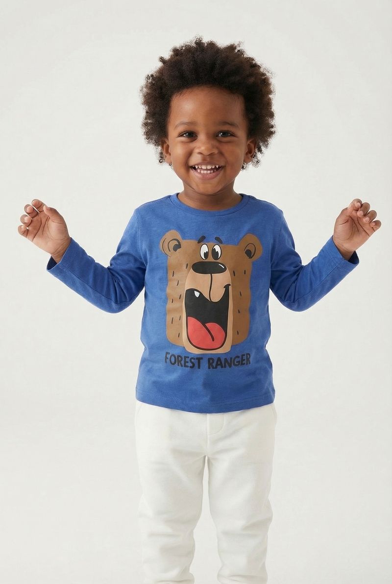 A Camiseta Infantil Caedu Manga Longa Azul Urso Forest Ranger oferece conforto e estilo para os pequenos. Com sua cor azul vibrante e estampa divertida de urso cartunesco "Forest Ranger", esta roupa infantil é perfeita para aventuras diárias, garantindo um visual alegre e aconchegante.